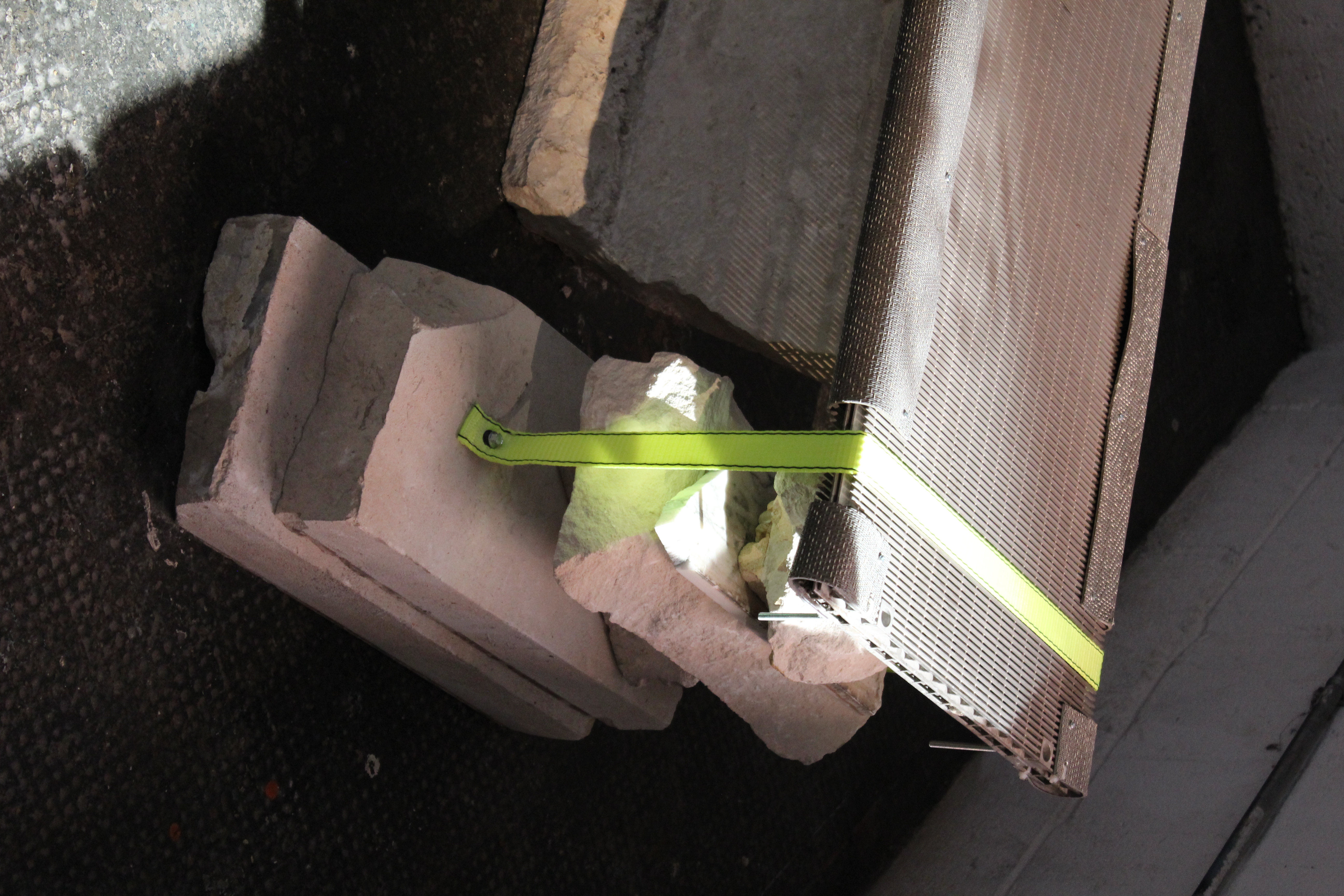 “These pieces lent themselves to study seating, so we created a stacked design, drilling through each piece and assembling them on a threaded rod. All of our work follows the circular design principle to enable disassembly and reuse, so fixtures like bolts, lashing straps, knots and screws visibly feature in our design aesthetic. In the stone bench, we bolted and strapped a metal floor grill to the stone to create a seat, then added a softer element with plastic carpet tiles.”