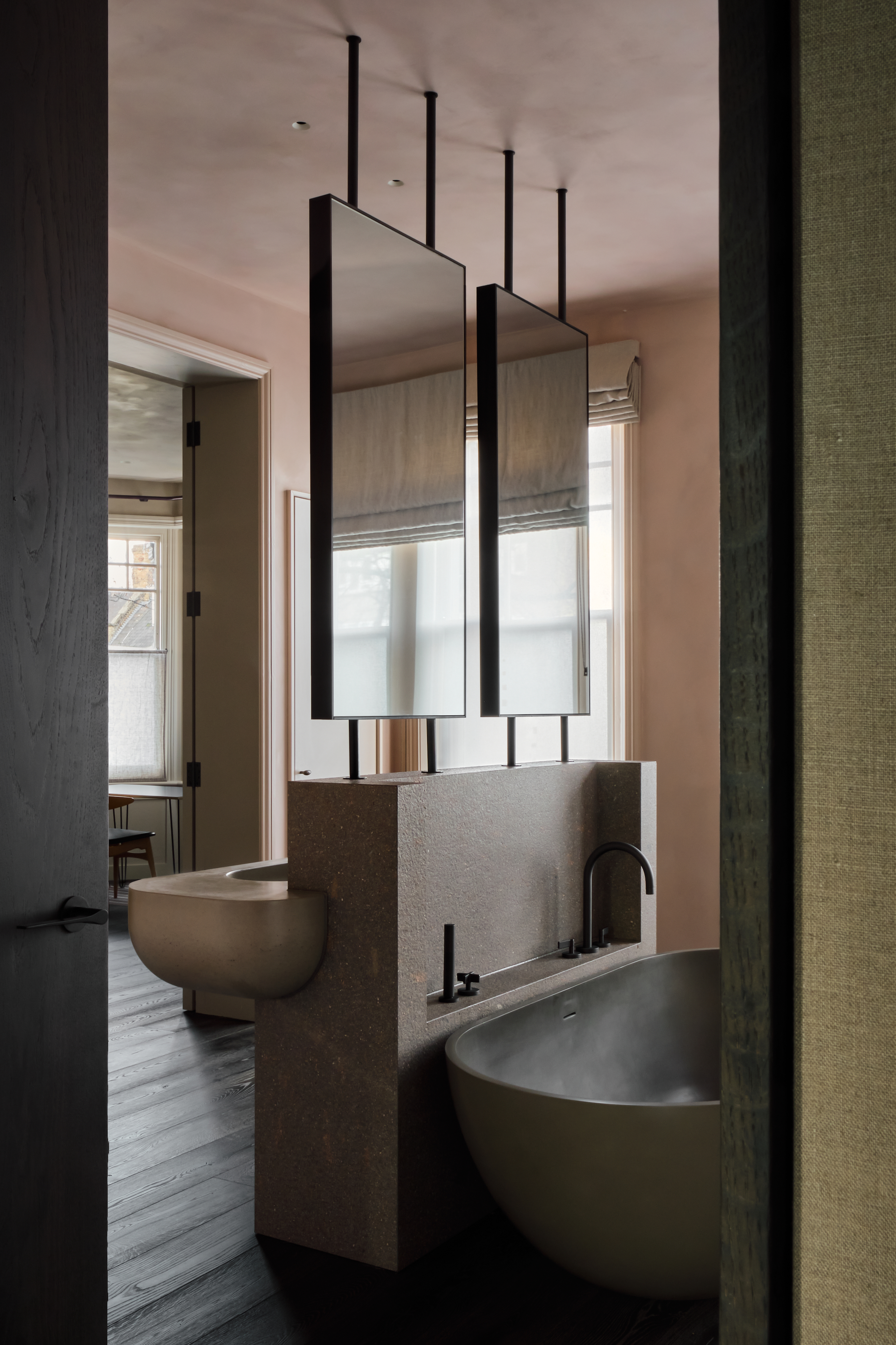 Titled House of Porphyry, the project’s name reflects the prominent use of porphyry stone, which appears in two fireplaces and the principal bathroom, where large blocks form a dramatic feature wall paired with a cast-concrete basin and bespoke brass mirrors. “We wanted materials that felt robust and enduring, that would ground the interiors and bring a sense of calm and longevity to the spaces,” says Henry Thorold, founding director at Mosley Thorold. “The porphyry gives the rooms a depth and richness that evolves with light and use.”
