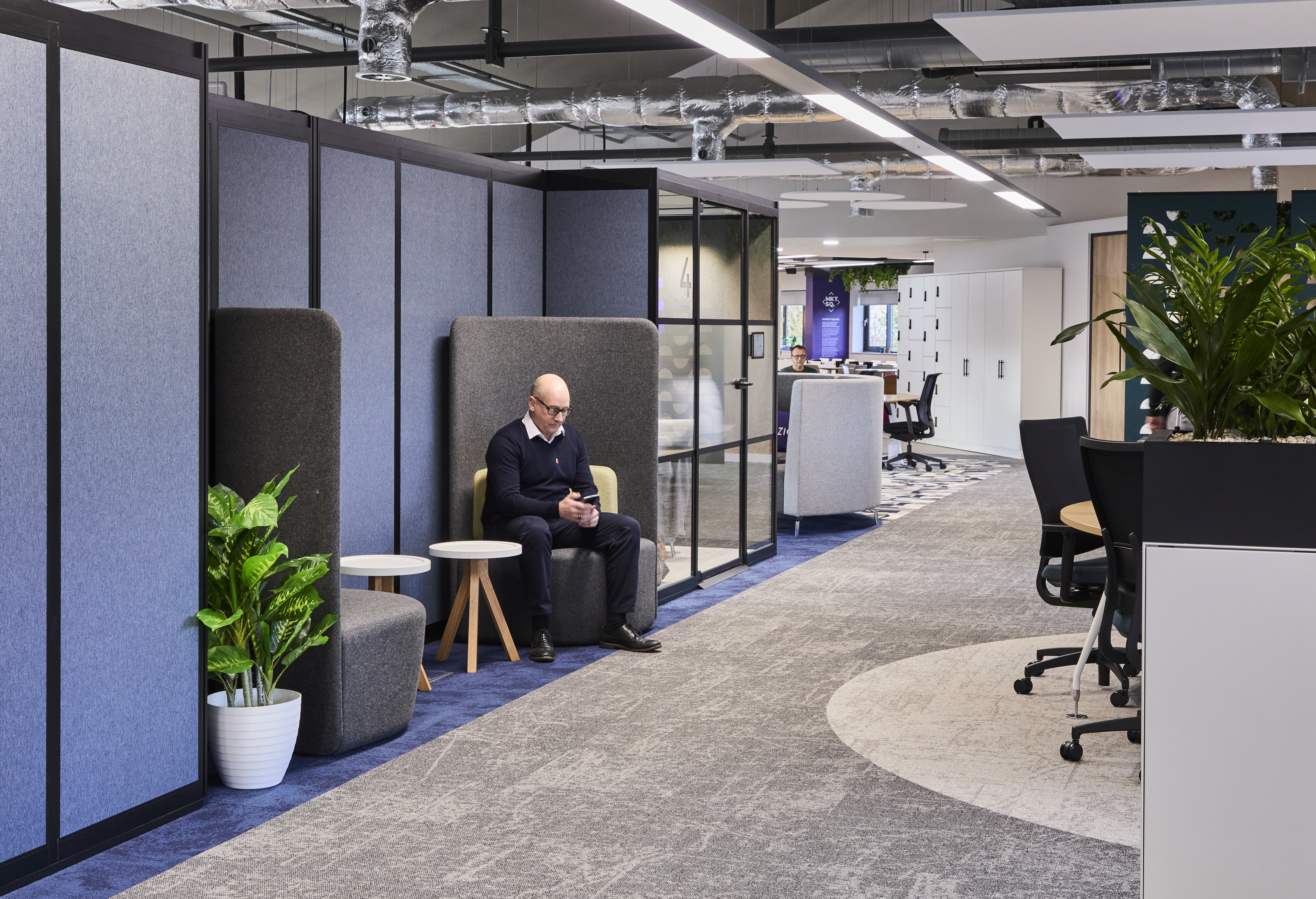 Sustainability underpinned the scheme from the outset. Existing furniture was retained where possible, energy-efficient lighting was introduced and workstations were arranged to maximise natural daylight. Alongside this, biophilic principles informed the palette, with natural textures, planting and muted tones used to create a connection to landscape and material.
