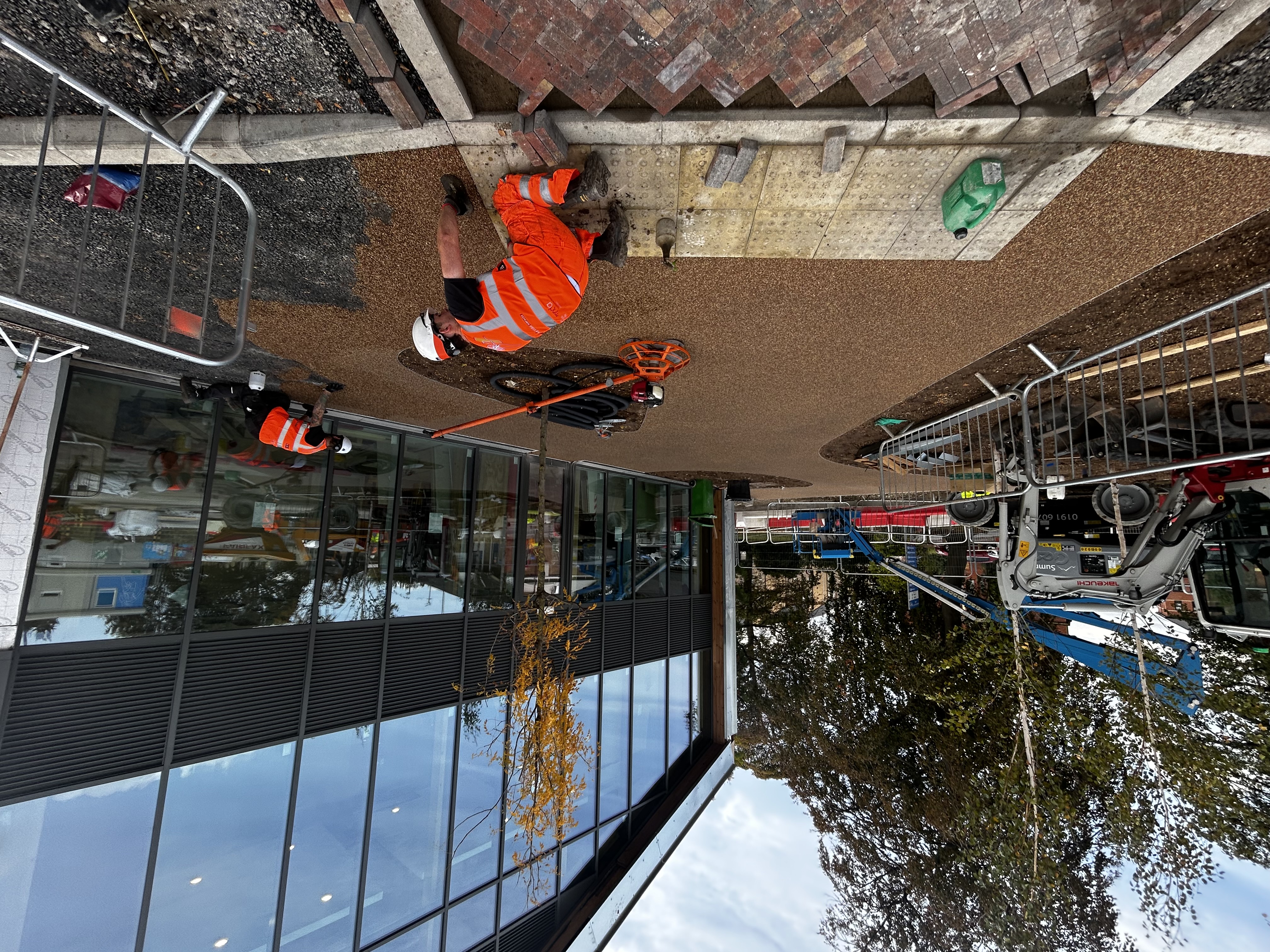 The company delivered 440m² of resin-bound surfacing, in an elegant Evening Rose blend supplied by long-term materials partner Vuba, across both the north and south elevations of the building. The installation supports accessible movement around the main entrance and weaves through the sensory garden and outdoor areas designed for patients and families. A dedicated five-person team carried out the works, including Anthony Irvine, former KBI project manager and now strategic partner, who once shared the pitch with Rob Burrow at Leeds.