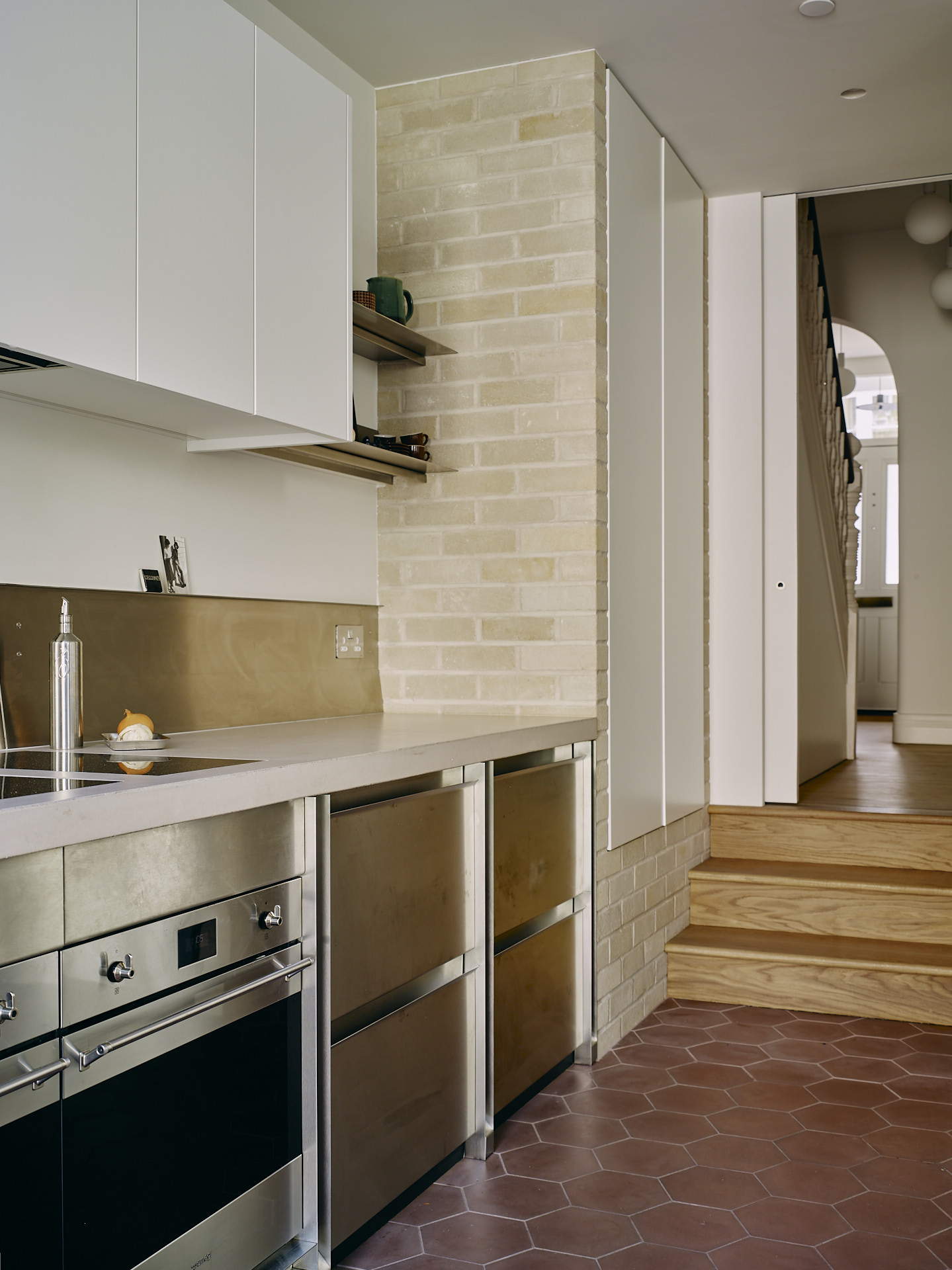 At ground floor, the stone brickwork is expressed internally as a thickened threshold between old and new. Niches carved into the masonry provide space for display and storage, fitted with bespoke steel shelving. Underfoot, hexagonal clay tiles define the kitchen zone, while the central island combines high-gloss cabinetry with a metal framework beneath a curved concrete worktop. The exposed aggregate finish of the concrete introduces subtle texture, creating a natural focal point for gathering, while trowelled surfaces to the working side provide a smoother finish for food preparation. Bespoke stainless-steel cabinetry and splashbacks reinforce the kitchen’s functional character, their folded detailing echoing the chamfered stone sills and mullions of the clerestory windows.