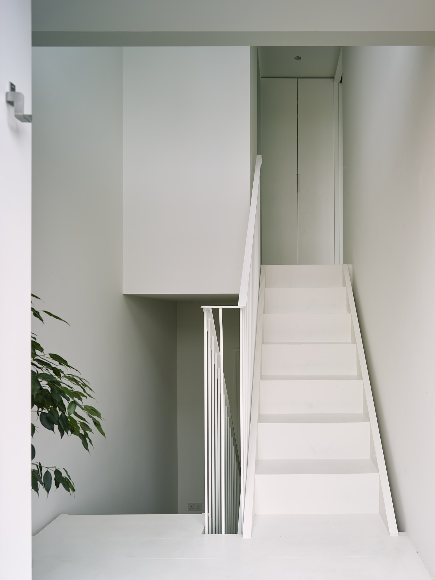 As the stair rises, the material language shifts decisively towards lightness. Offset from enclosing walls, the staircase is traced by a fine metal balustrade, drawing the eye upwards to a final clerestory opening that floods the stairwell with soft north light. At half-landing level, a door opens onto a newly formed roof terrace, offering long views across the city. Above, the loft is conceived as a calm retreat, its white-painted timber floorboards and powder-coated metal reveals forming a serene, gallery-like interior, complemented by a top-lit microcement bathroom.