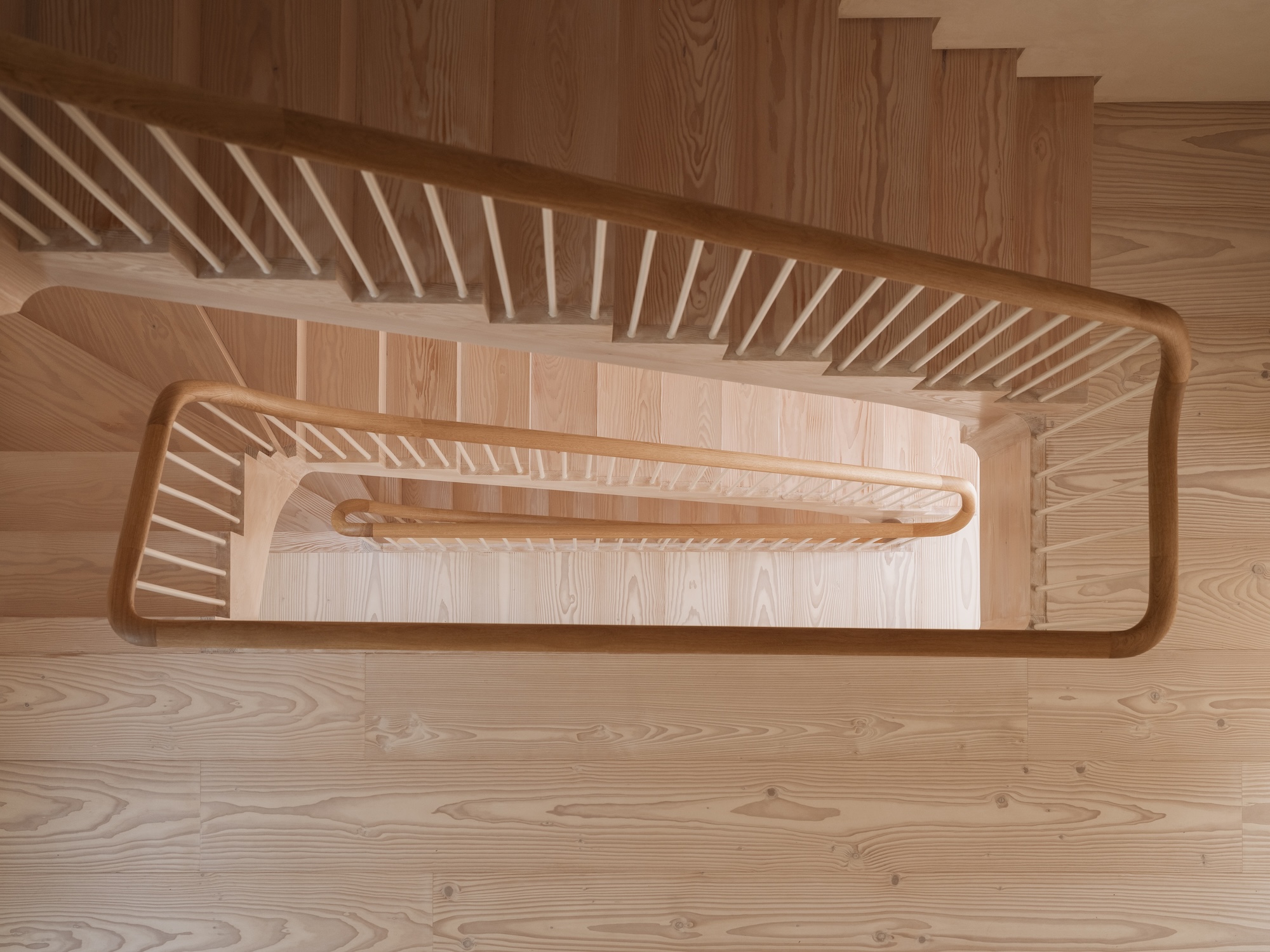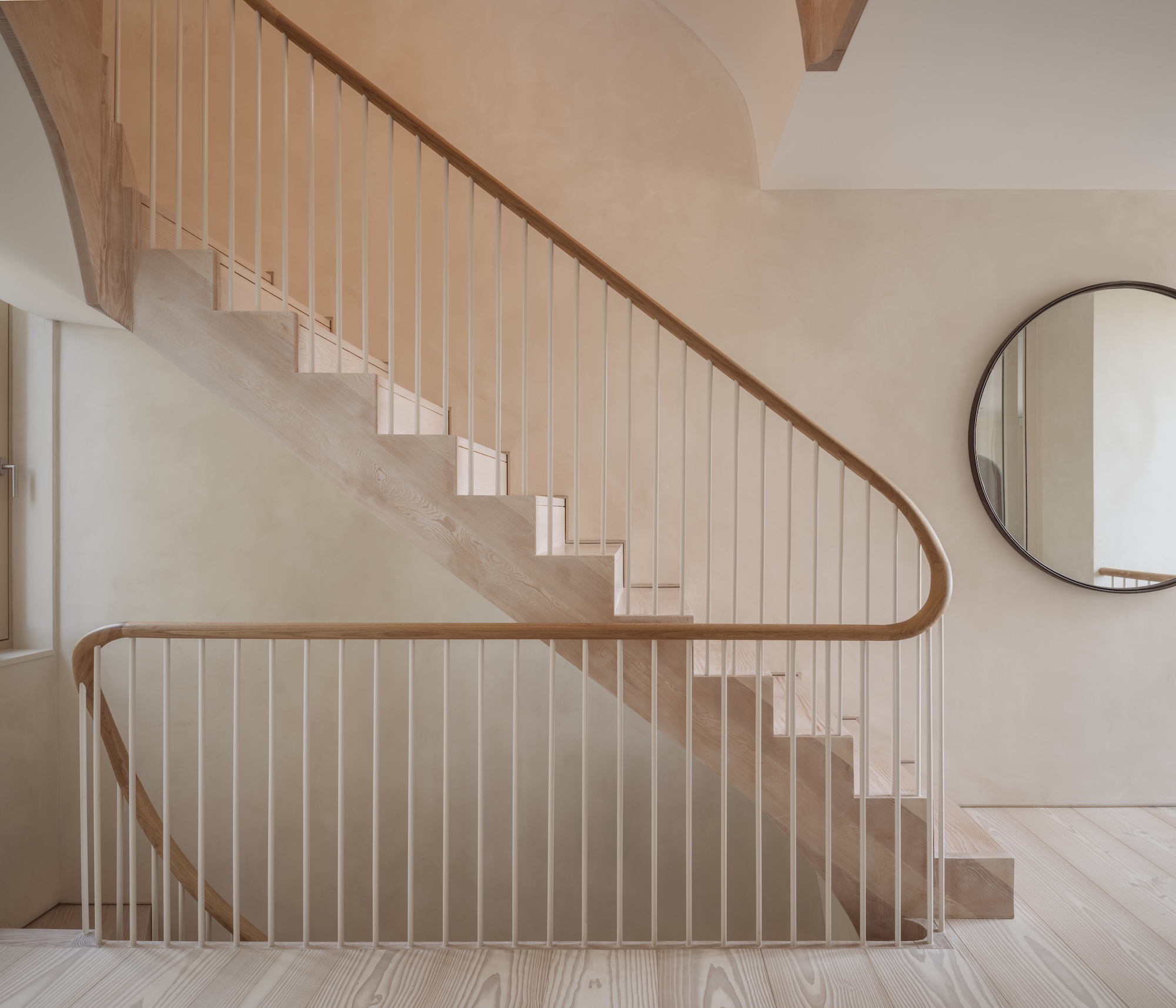 The all-important circulation is organised around a curving timber staircase that widens as it rises, increasing the sense of openness and access to daylight on upper levels. The layout accommodates both shared and private uses, with interconnected children’s rooms spanning old and new sections of the house, and a more secluded top-floor suite.