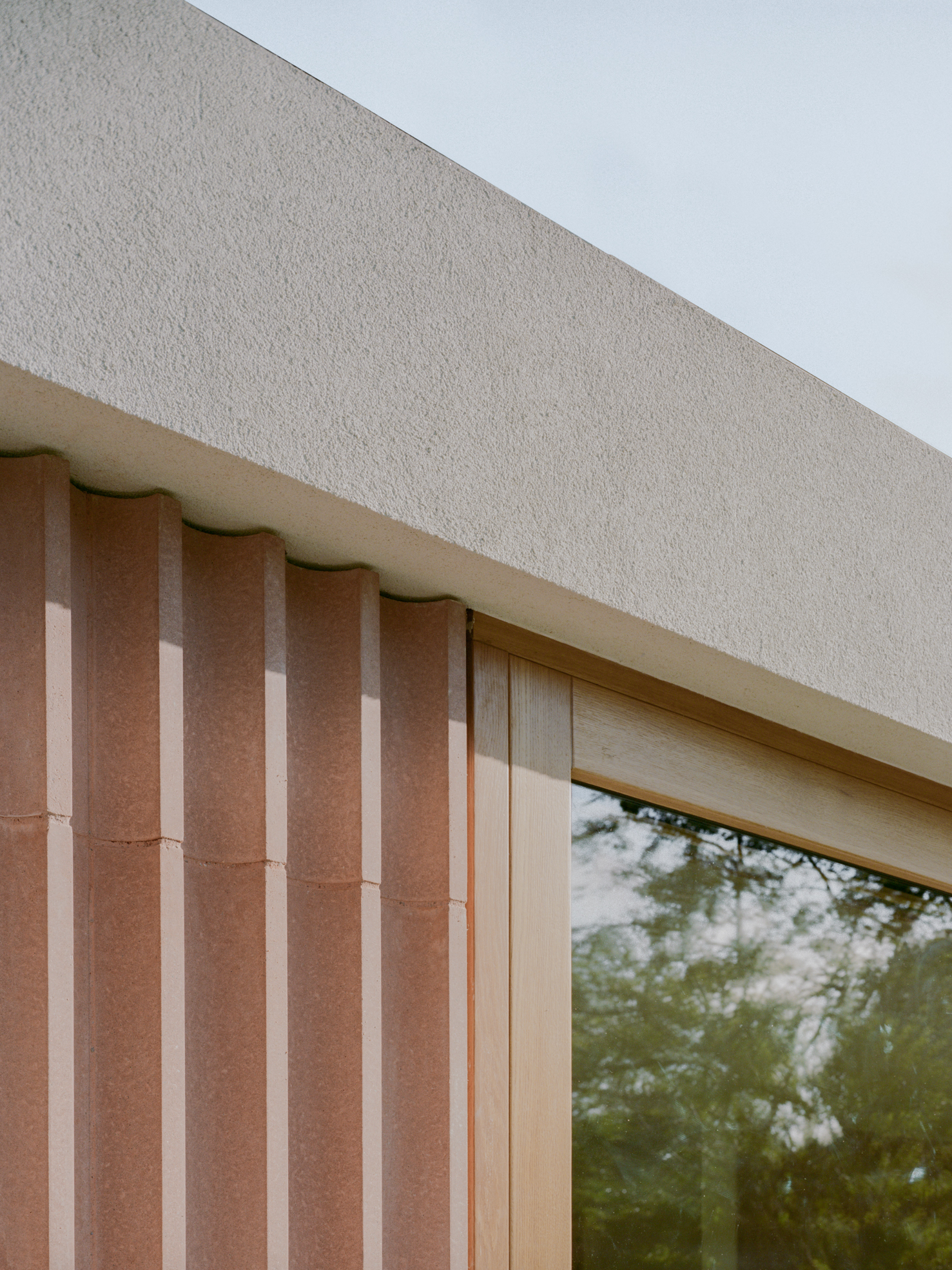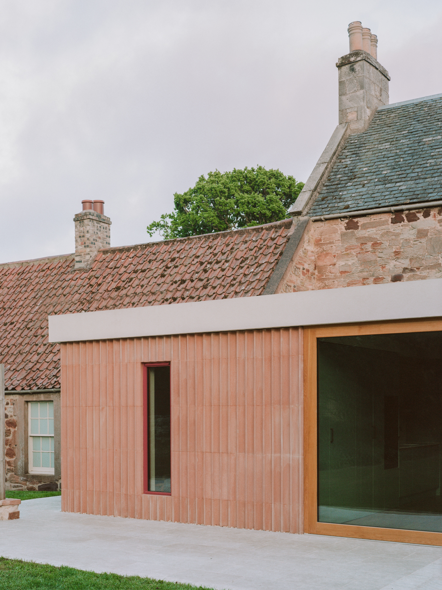 The new rear extension consolidates the disparate historic additions into a more legible composition. Central to this is a precast stone wall designed by the architects. Its pale, blush-toned colour draws directly from the existing East Lothian sandstone and brick, but the surface treatment is distinctly contemporary. Fluting introduces depth and rhythm, catching light and shadow in a way that gives the wall a changing character throughout the day. Rather than copying historic tooling or coursing, the stonework acknowledges its neighbours through proportion, colour and weight.