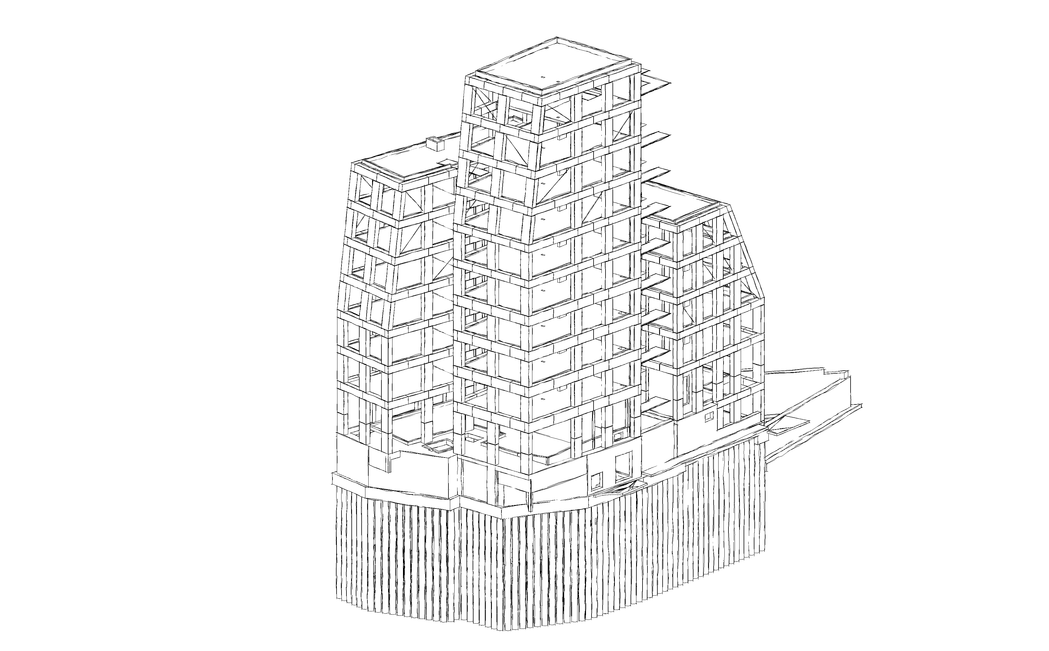 The redevelopment at Finchley Road continues to evolve as one of the UK’s most ambitious demonstrations of load-bearing stone construction. Although still a work in progress, the project has already become a reference point for architects and engineers exploring alternatives to carbon-heavy steel and concrete. The scheme, designed by Groupwork and led by architect Amin Taha with structural engineering from Webb Yates, has followed a winding procurement journey with plenty of changes along the way. Yet its central idea has remained: a tall, fully structural stone exoskeleton built to modern fire standards, offering long-term carbon savings through minimal processing and an (almost) self-finished envelope.