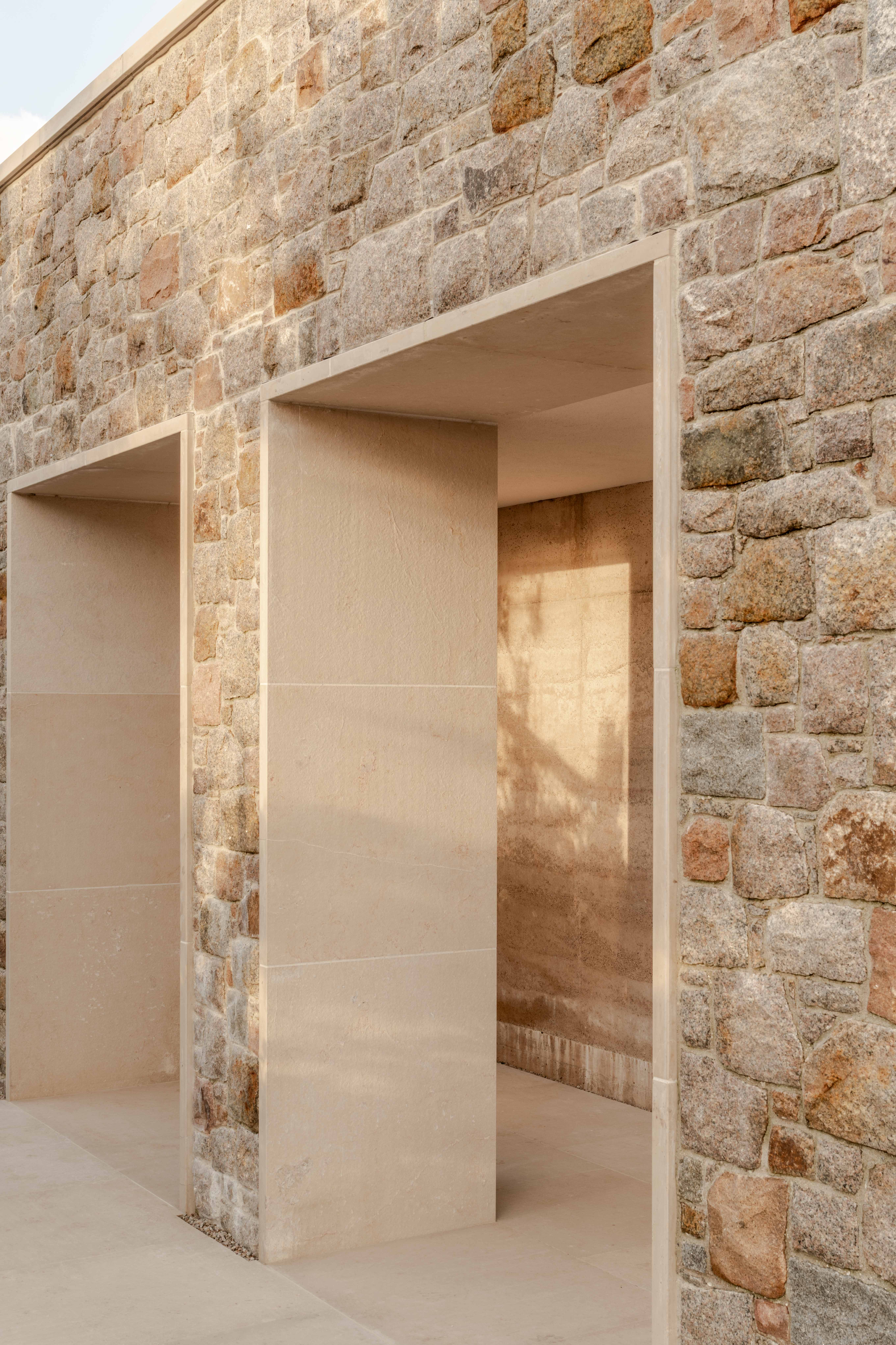 In a further refinement of material integration, granite dust produced during stone processing was incorporated into the rammed earth aggregate, creating a bespoke stabilised earth mix developed specifically for the project. This process, undertaken in collaboration with Rammed Earth Structures and structural engineers Elliott Wood, involved extensive testing to achieve the desired texture, colour and performance. The result subtly embeds the stone into the fabric of the building, reinforcing the material continuity between structure and surface.