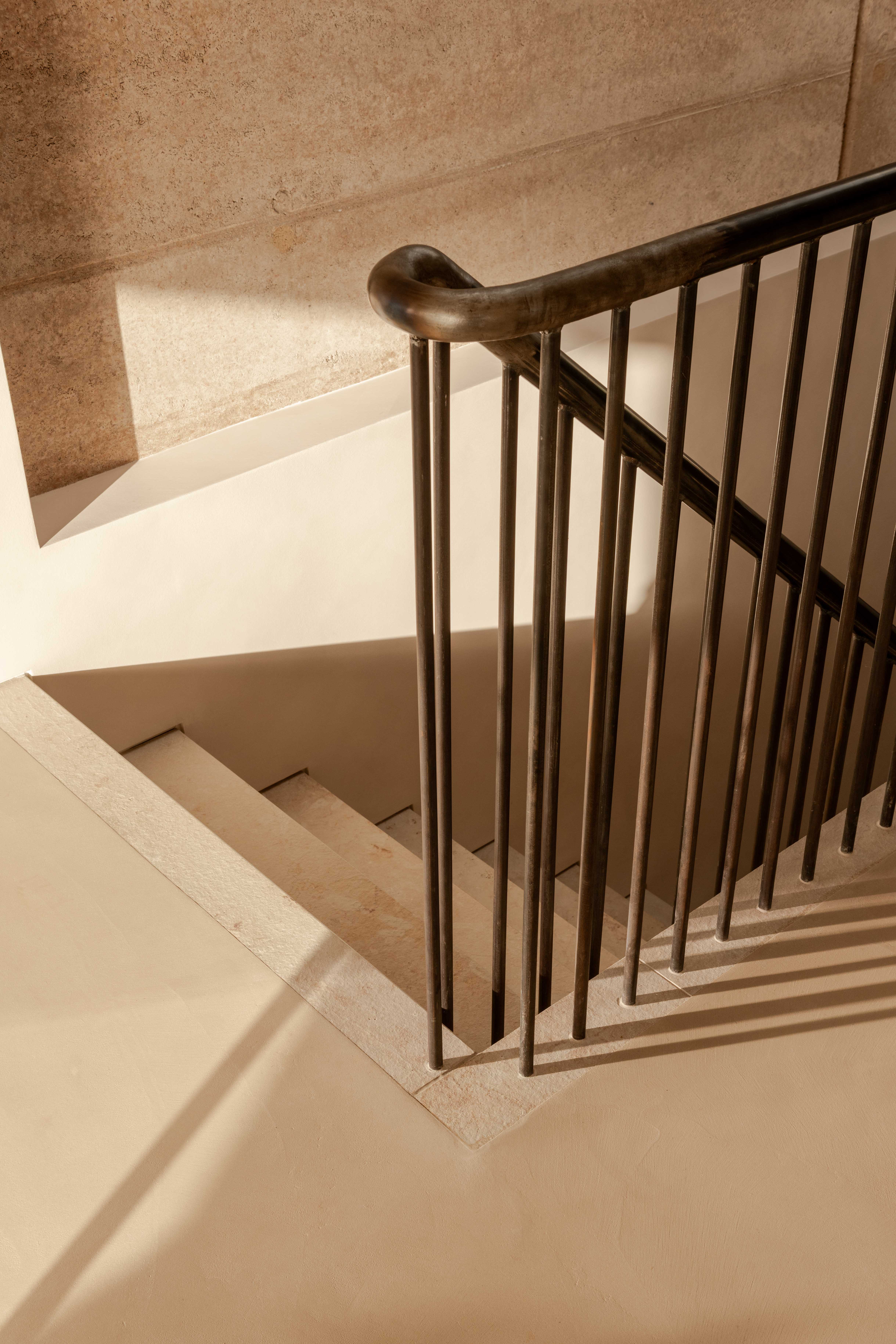 Material continuity between floors is reinforced through the use of cream-coloured limestone, employed for external window reveals before reappearing internally as a continuous band rising up the stair and flowing around the floor opening. It also forms the kitchen worktops and frames bespoke timber cabinetry designed by Fieldwork. The stone’s finish shifts according to use: flamed underfoot to reveal fossil textures, and polished smooth for working surfaces.
