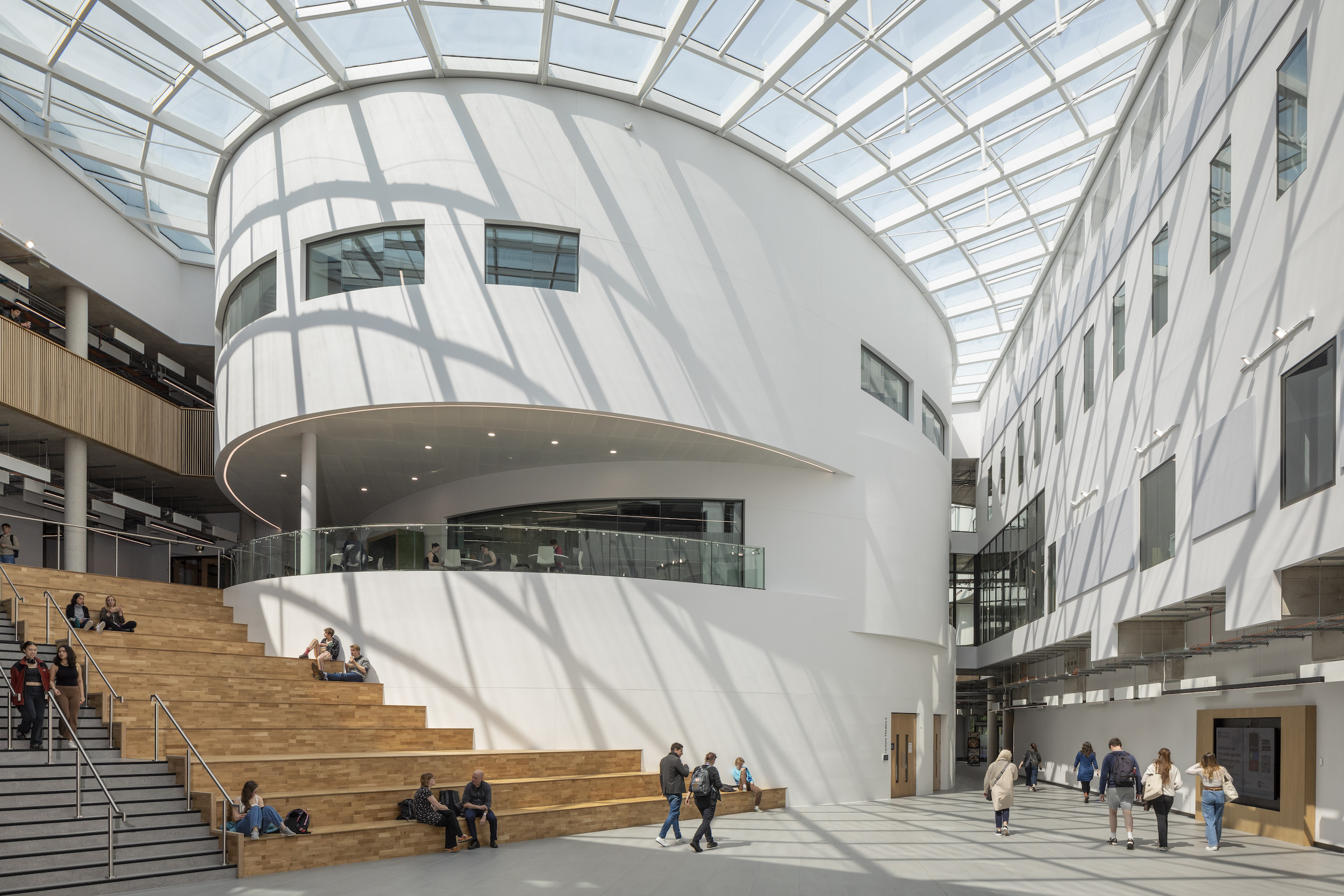 Sheffield University's Faculty of Social Sciences has undergone a large scale transformation with the introduction of a mini campus called The Wave – uniting facilities that were previous spread across 18 separate buildings. Designed by HLM Architects with a budget of £65m, the nucleus of the project is The Drum – a circular lecture block comprising three levels with lecture theatres inside, surrounded by mezzanines with tables and chairs for study or socialising and topped with a glass roof to let the light flood in.