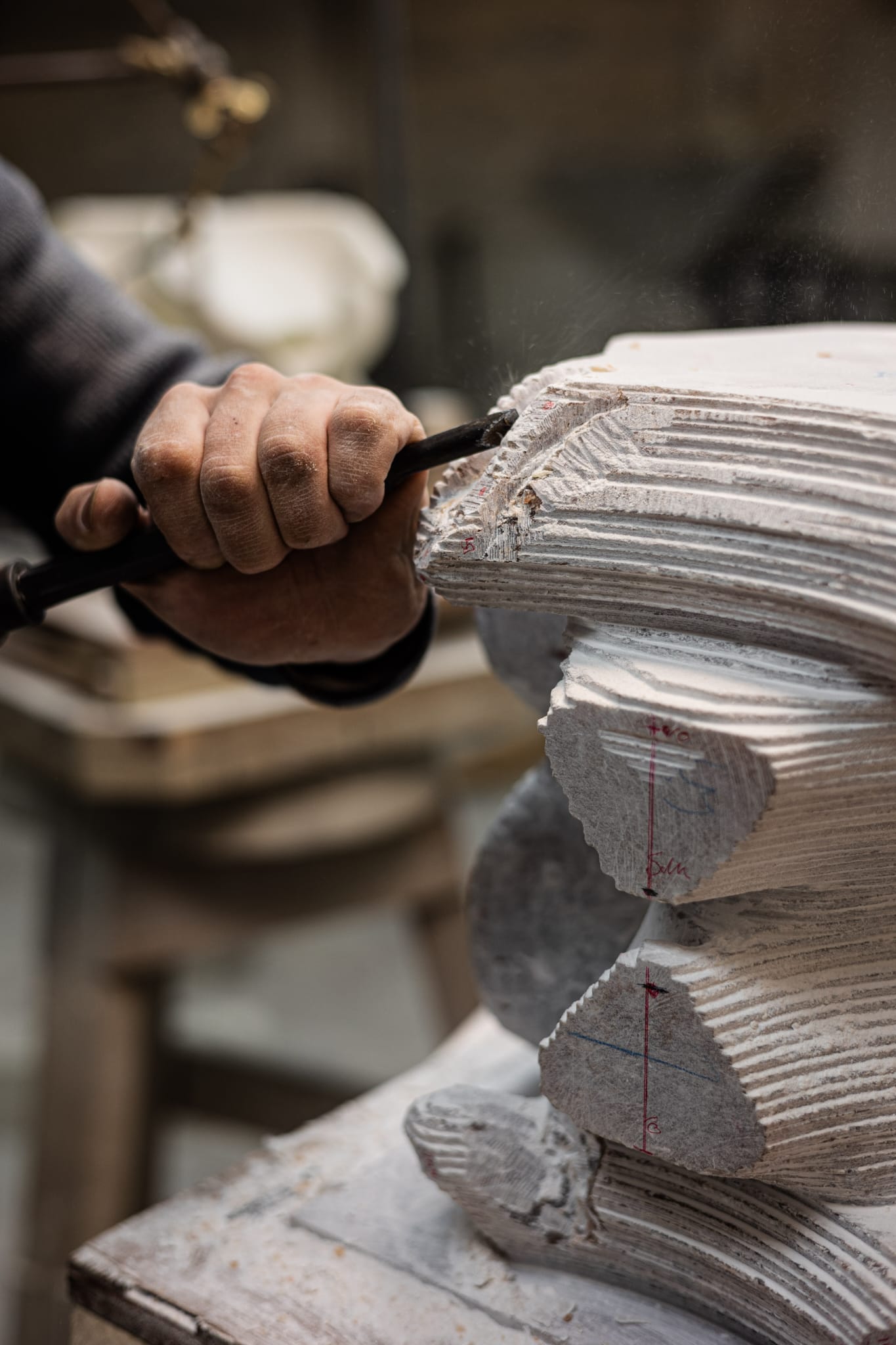 There is a further layer of material specificity in the choice of stone. “Alabaster from sites such as Fauld is now comparatively rare, as extraction has significantly declined, adding a further layer of material specificity without overstating issues of availability,” Mondragon says.