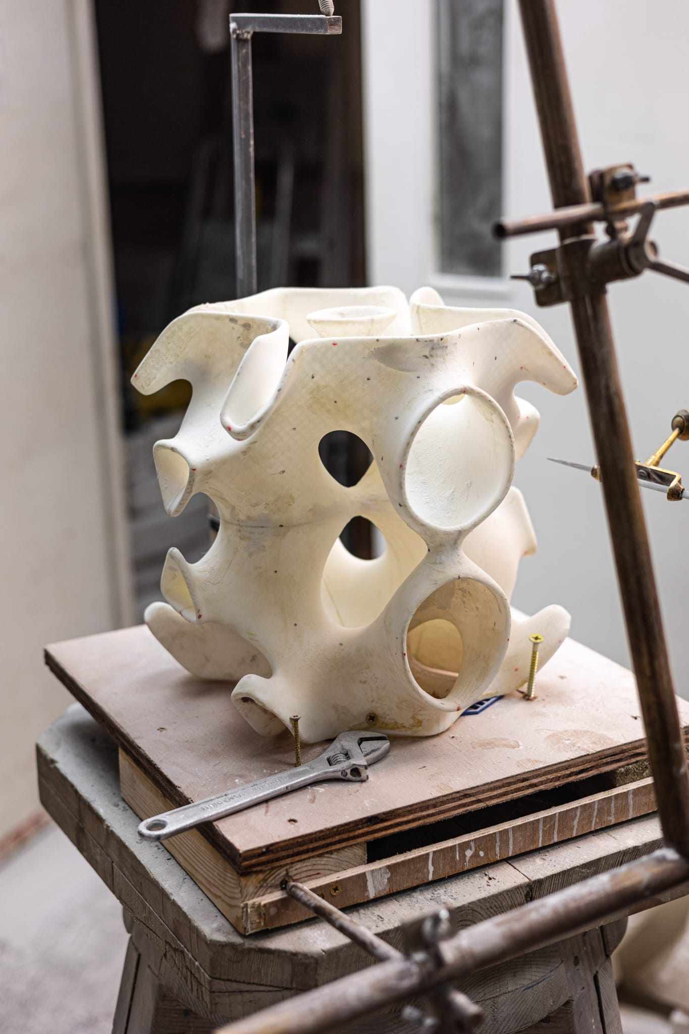 The piece is still in progress, with Mondragon refining its contours through a close, hands-on relationship with the stone at London Stone Carvers. As the form emerges, the surface appears to ripple and pulse, its carved undulations catching and diffusing light. Alabaster is central to that effect: its relative softness allows for finely modulated carving, while its translucency introduces depth and a subtle internal glow.
