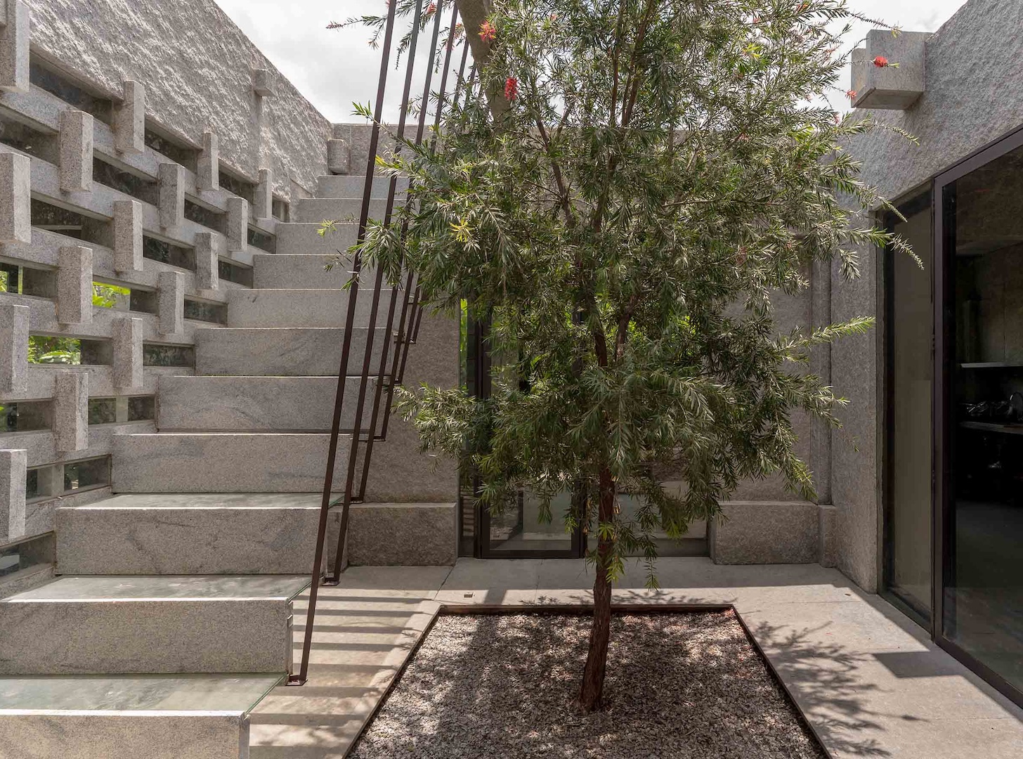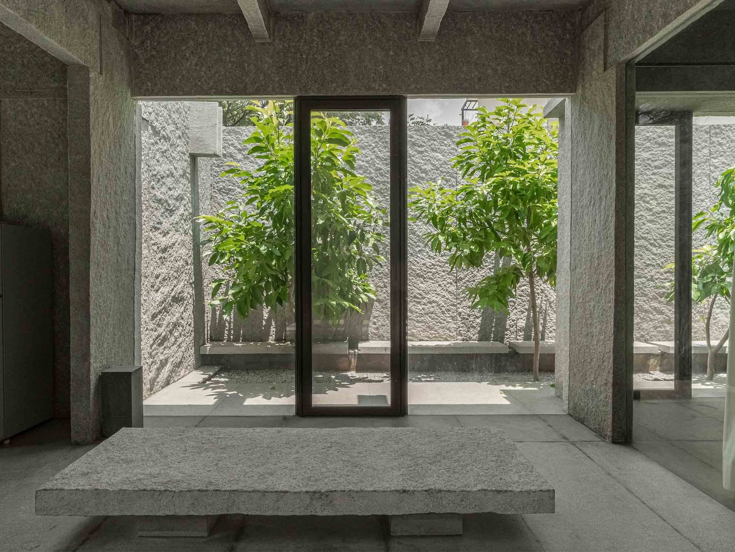 The building has a poetic quality born out of an ephemeral moment of revelation in which Senthil noticed how the elongated rays of the setting sun discernibly softened the solidity of the stone walls of a South Indian temple complex. This subtle, yet stimulating visual memory has stuck with Senthil’s, and when beginning designs for the space, he naturally turned to stone.