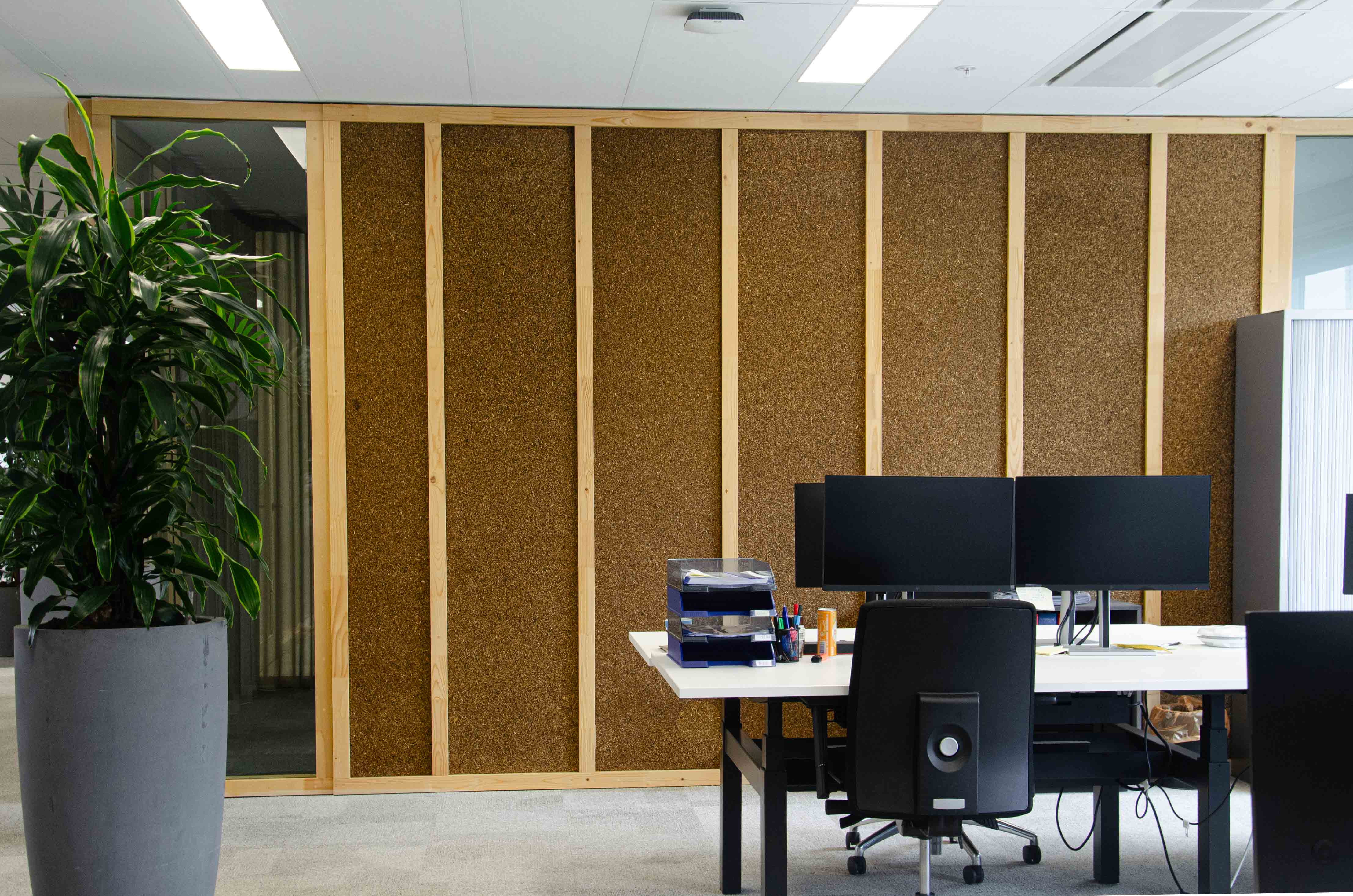 While the panels don’t fall into the biomimicry camp, their acoustic performance still relies on the inherent structure of plant fibres. Their porous composition absorbs ambient sound while remaining breathable, helping regulate humidity and contribute to a healthier indoor environment. Rather than applying technology onto a surface, Compostboard allows the material itself to perform acoustically, as if relying on an inherent, natural technology of sorts.