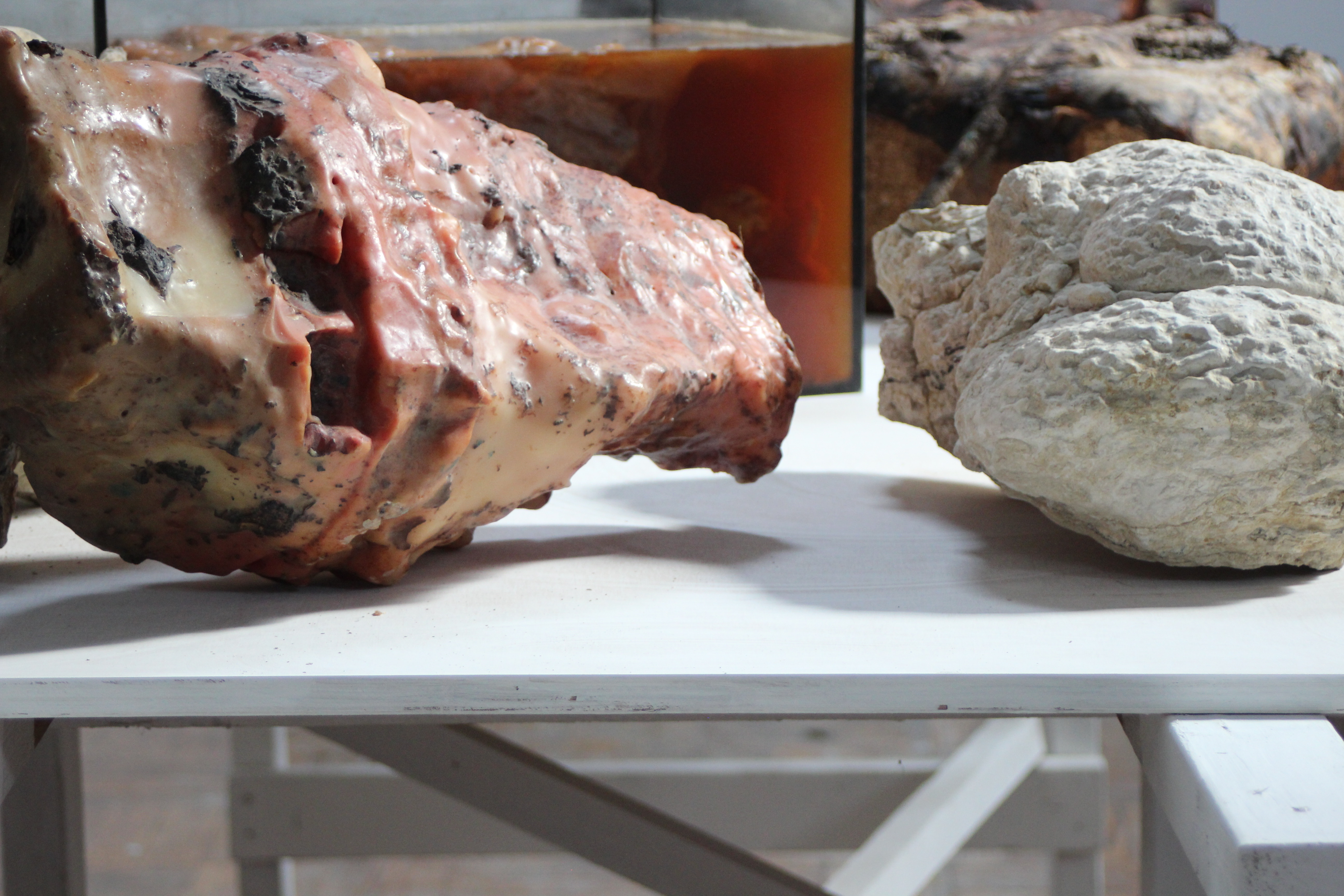 For Artist Jane Fox that meant cultivating biodegradable “fossils” using probiotic microbial cellulose combined with kelp. Probiotic Fossils – Tiny Builders of the Natural World, takes direct inspiration from Portland’s ancient stromatolite formations - layered rocks created by the salivary secretions of Cyanobacteria. These microscopic organisms sit at the foundation of global life systems, constructing entire ecologies from coral reefs upwards and helping maintain environmental homeostasis. Cyanobacteria are also present in SCOBY (Symbiotic Colonies of Bacteria and Yeasts), which ferments tea and sugar to generate microbial cellulose within a miniature, self-sustaining ecosystem. Like the stromatolites they once built, Fox’s probiotic cellulose grows in successive layers through microbial by-products.