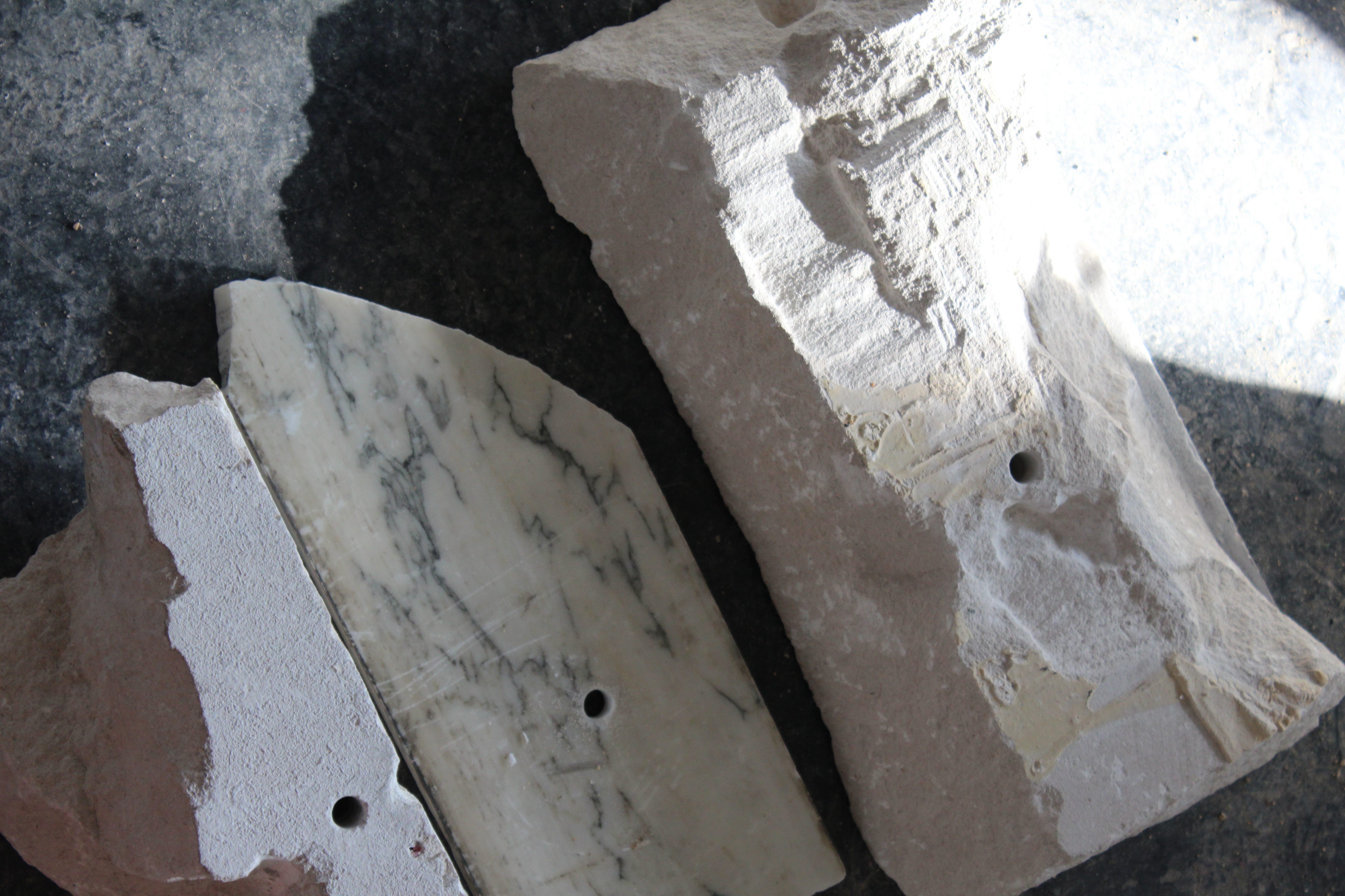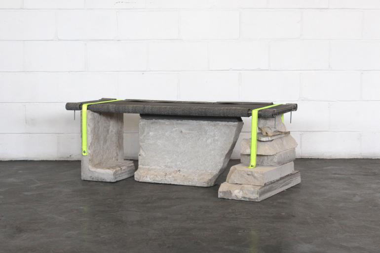 “These pieces lent themselves to study seating, so we created a stacked design, drilling through each piece and assembling them on a threaded rod. All of our work follows the circular design principle to enable disassembly and reuse, so fixtures like bolts, lashing straps, knots and screws visibly feature in our design aesthetic. In the stone bench, we bolted and strapped a metal floor grill to the stone to create a seat, then added a softer element with plastic carpet tiles.”