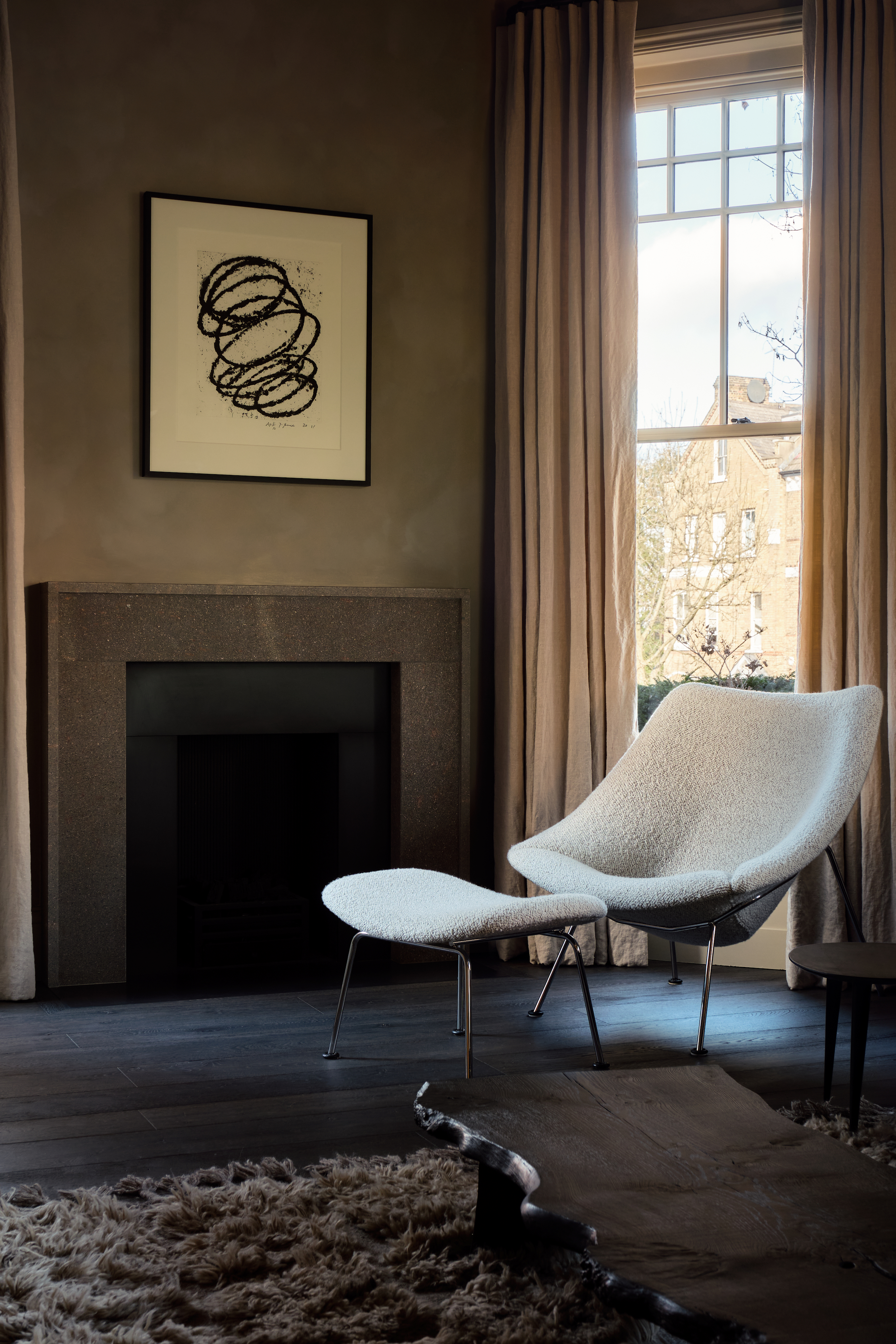 Titled House of Porphyry, the project’s name reflects the prominent use of porphyry stone, which appears in two fireplaces and the principal bathroom, where large blocks form a dramatic feature wall paired with a cast-concrete basin and bespoke brass mirrors. “We wanted materials that felt robust and enduring, that would ground the interiors and bring a sense of calm and longevity to the spaces,” says Henry Thorold, founding director at Mosley Thorold. “The porphyry gives the rooms a depth and richness that evolves with light and use.”