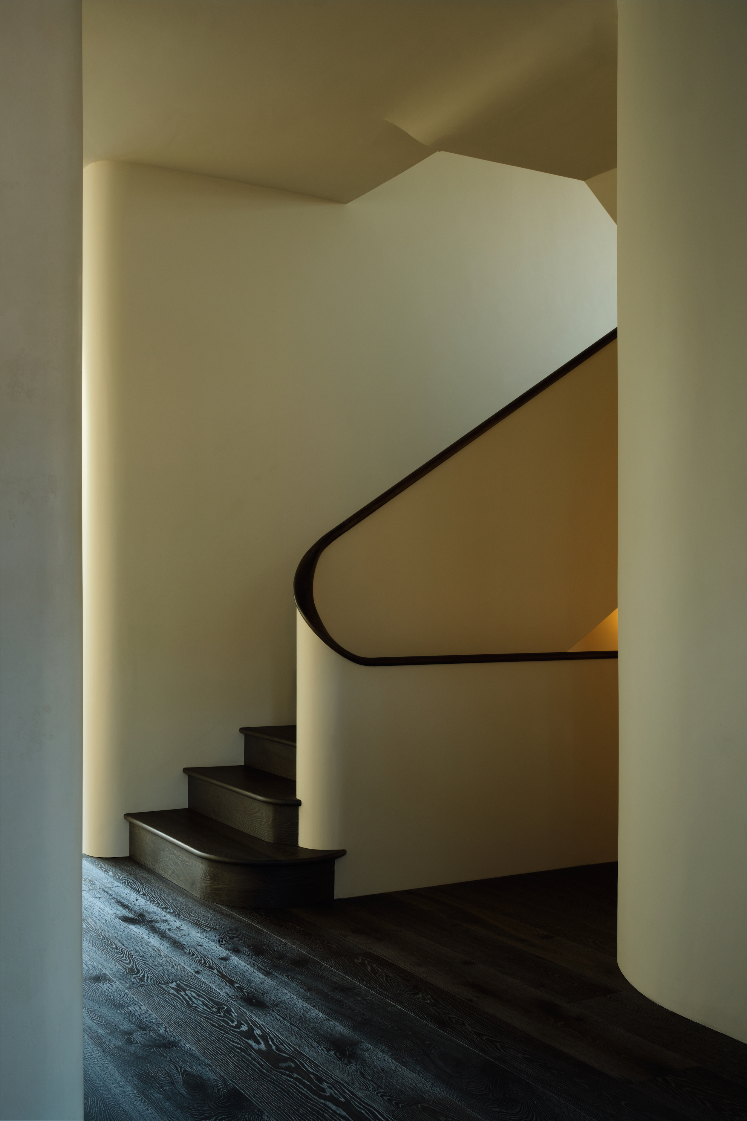 In addition to the use of porphyry stone, the material palette is carefully balanced. Dark oak boards, oak doors and bespoke joinery provide rhythm and cohesion, while a curved plaster balustrade and sculptural solid timber handrail soften the stair core. Patinated bronze ironmongery introduces subtle tactility, selected to age gracefully with everyday use. Together, these elements form a layered and restrained palette, designed to withstand the demands of family life while rewarding close engagement.