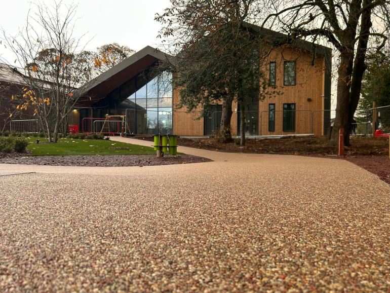The company delivered 440m² of resin-bound surfacing, in an elegant Evening Rose blend supplied by long-term materials partner Vuba, across both the north and south elevations of the building. The installation supports accessible movement around the main entrance and weaves through the sensory garden and outdoor areas designed for patients and families. A dedicated five-person team carried out the works, including Anthony Irvine, former KBI project manager and now strategic partner, who once shared the pitch with Rob Burrow at Leeds.