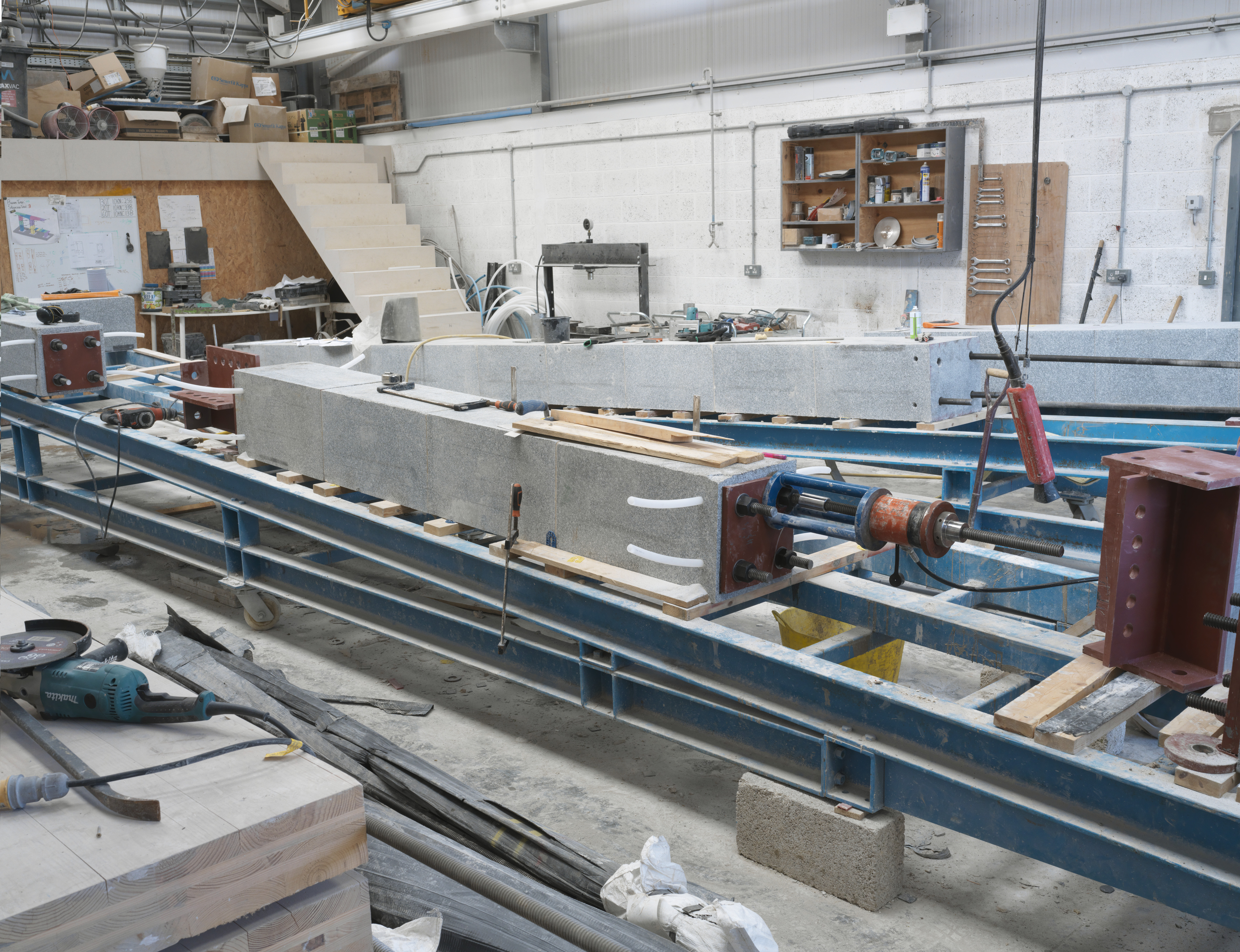 At the heart of the Demonstrator is a pre-tensioned stone frame developed and patented by The Stonemasonry Company. The system uses mechanically connected stone elements – beams and columns – assembled with threaded steel bars that are tensioned to place the stone into compression.