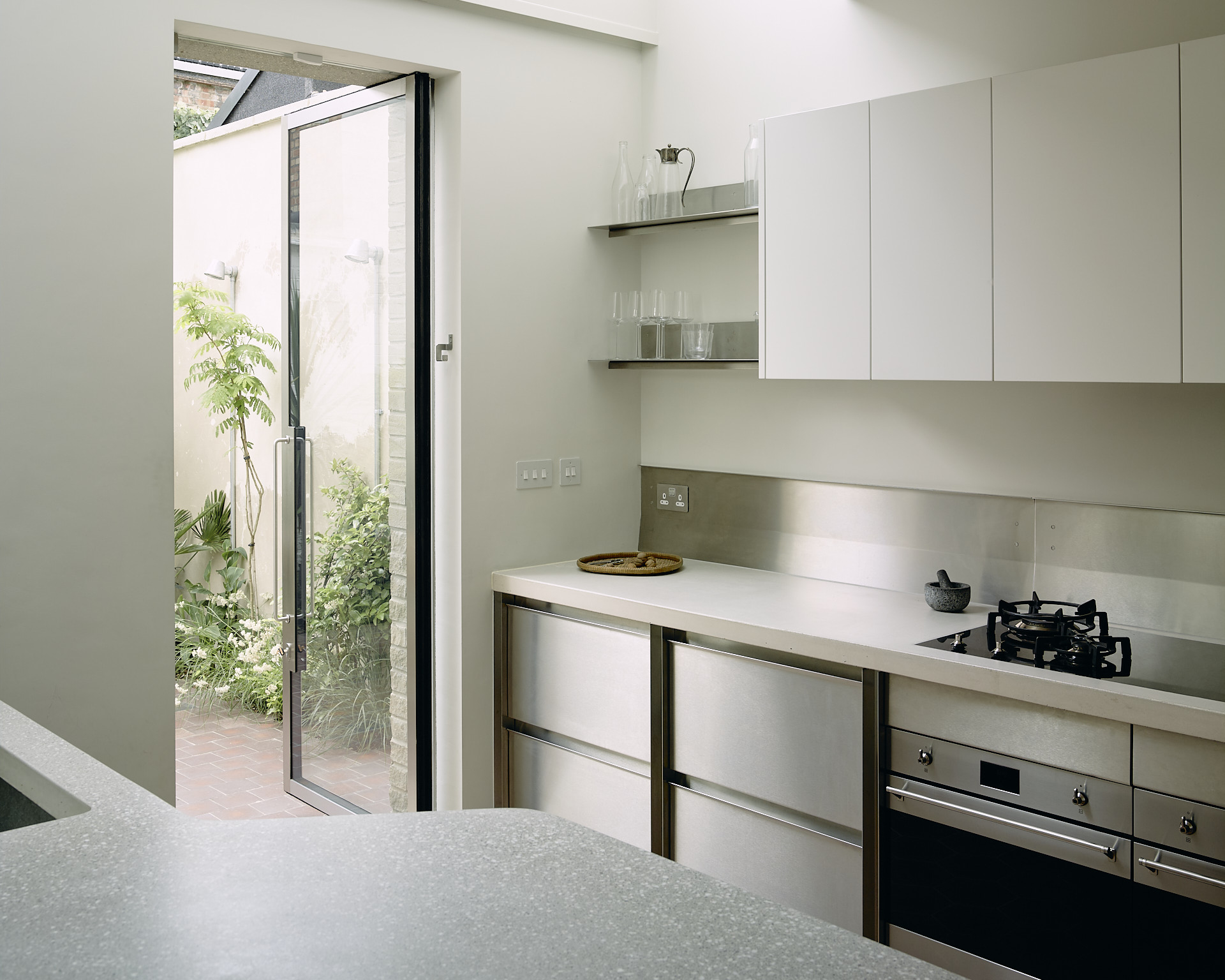 Working with minimal external space and a compact north-facing garden, DGN limited the depth of the rear extension in order to preserve outdoor amenity. Instead, the practice exploited vertical volume, creating a double-height dining space that brings daylight deep into the plan. High-level clerestory windows framed in stainless steel introduce a band of light across the rear elevation, lending a sense of generosity and scale that belies the modest footprint.