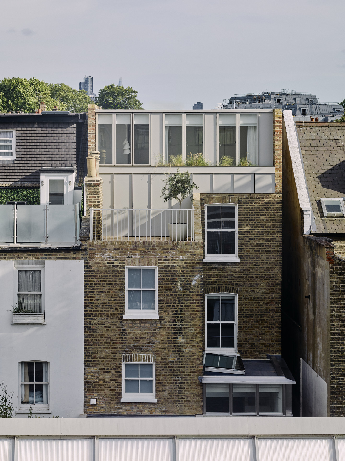 At the base of the scheme is a stone-brick extension, capped by a lightweight stainless-steel and glazed roof structure. The approach allows the house to remain grounded in the earthy tones and textures of its London context, while opening the interior to sky and light. Throughout, the architects pursued a material language in which mass, tactility and weight gradually give way to lightness and precision, producing a spatial sequence that mirrors the vertical journey through the building.