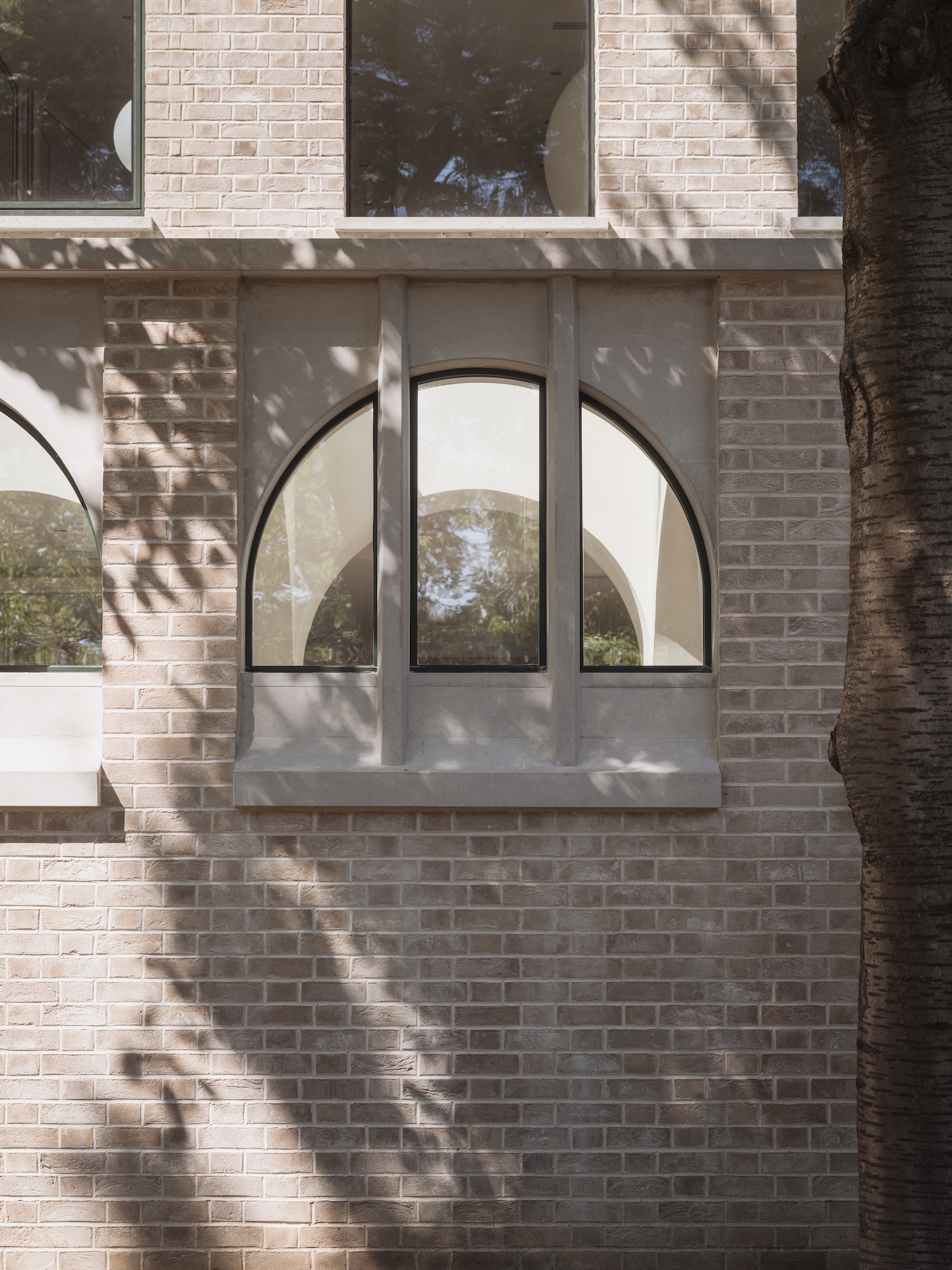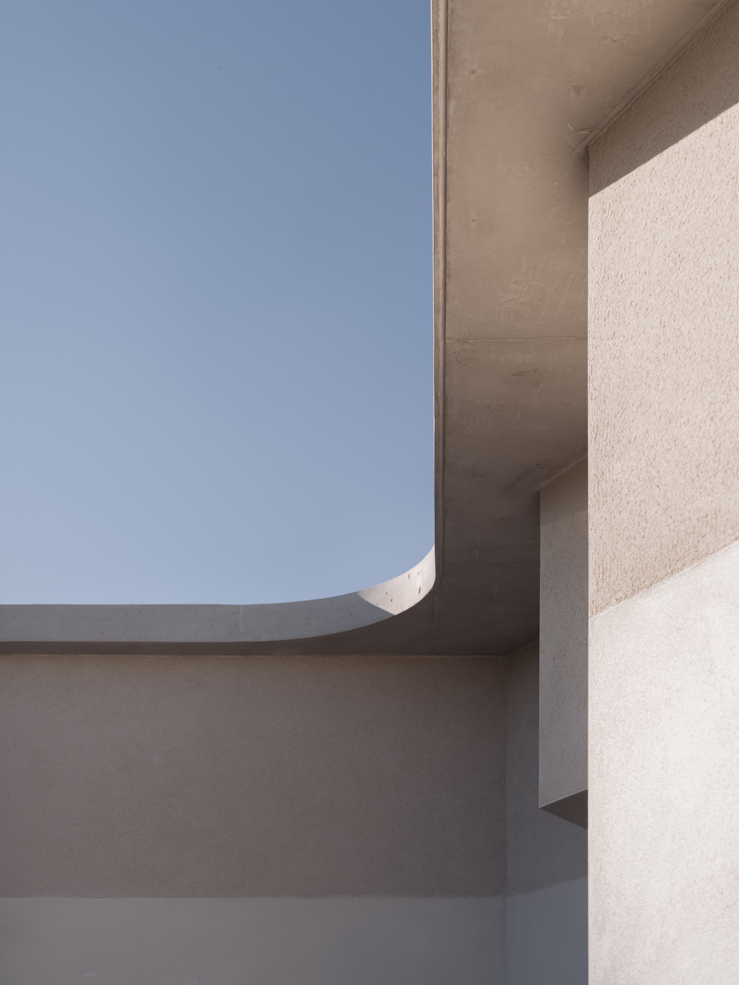 Tasteful curved masonry forms are a defining feature throughout, appearing both externally and internally. Arched openings and sculpted surfaces catch light and soften transitions between spaces, lending the building a sense of weight and continuity. The upper level includes an accordion-like façade, which juxtaposes the smooth arcs, yet still manages to subtly soften the exterior through fractured light patterns.