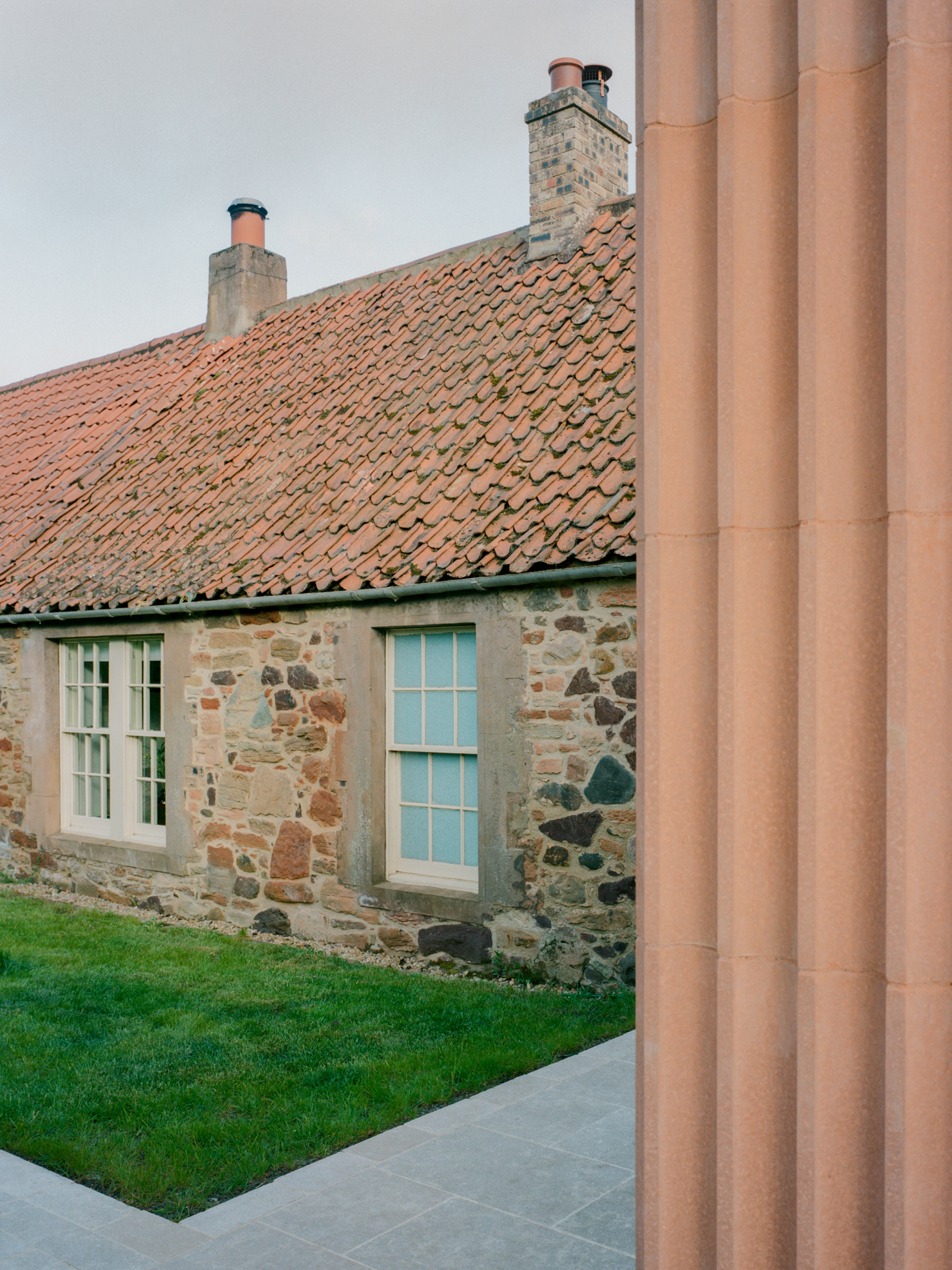 The new rear extension consolidates the disparate historic additions into a more legible composition. Central to this is a precast stone wall designed by the architects. Its pale, blush-toned colour draws directly from the existing East Lothian sandstone and brick, but the surface treatment is distinctly contemporary. Fluting introduces depth and rhythm, catching light and shadow in a way that gives the wall a changing character throughout the day. Rather than copying historic tooling or coursing, the stonework acknowledges its neighbours through proportion, colour and weight.