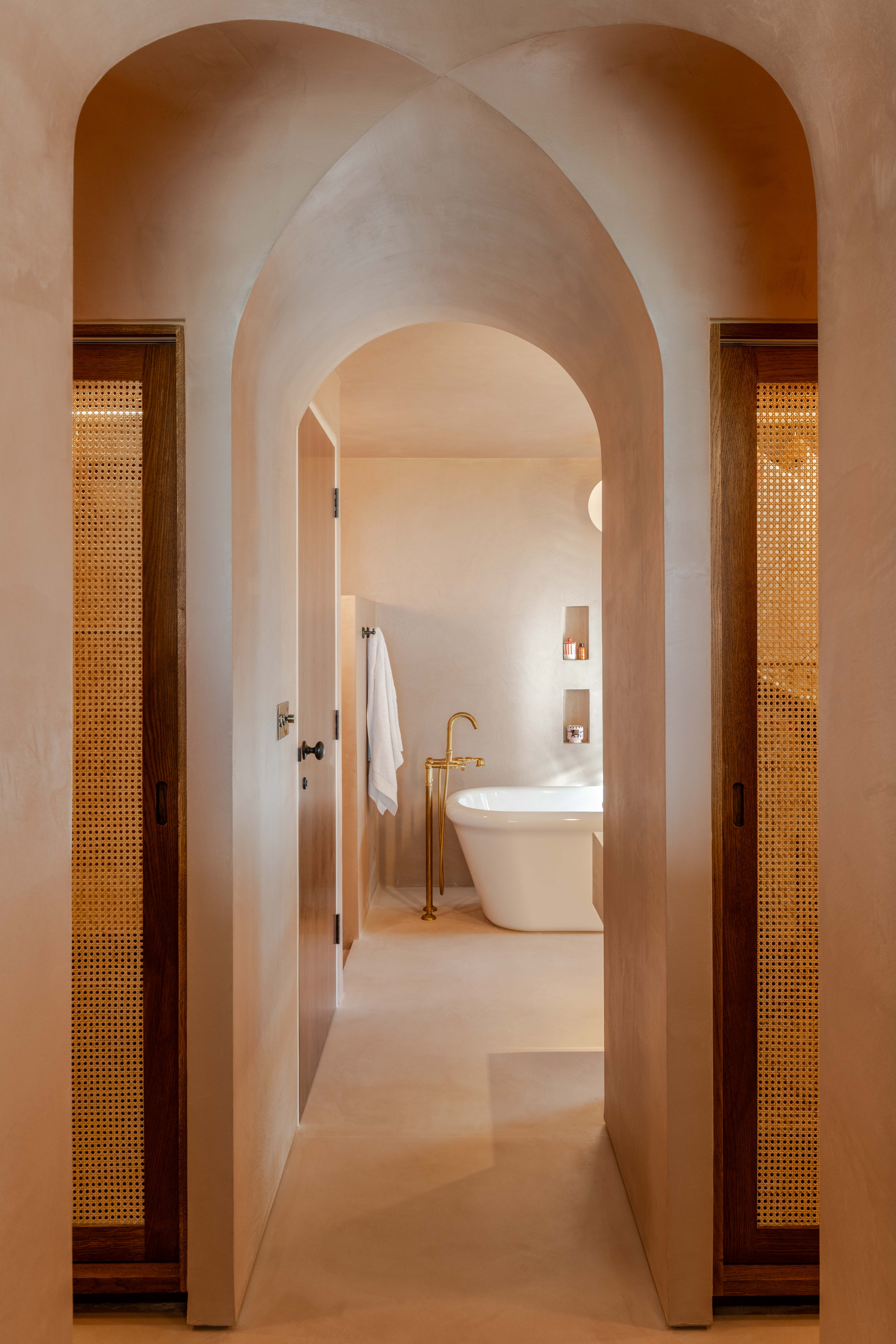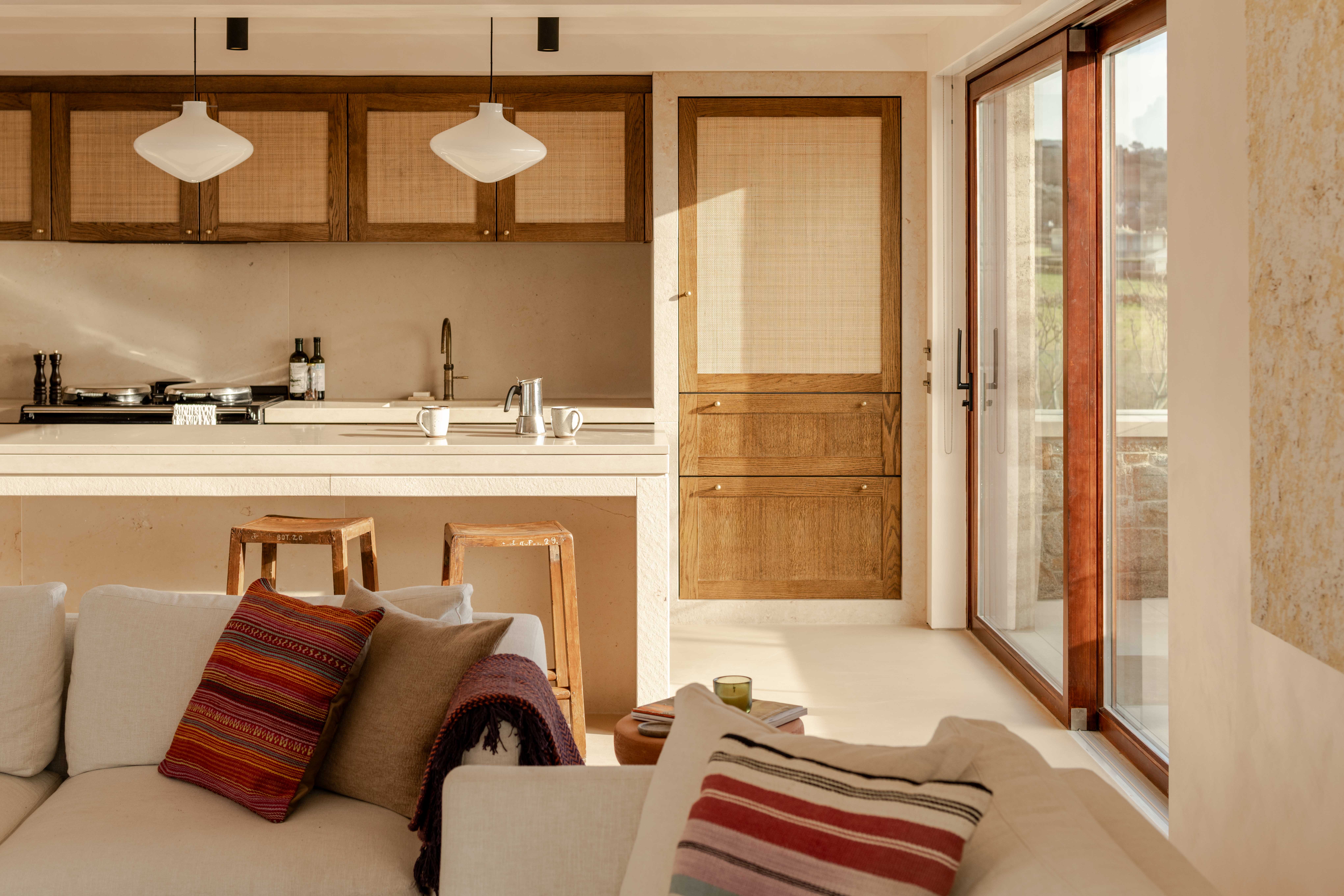 Internally, a section of the rammed earth core is left exposed, revealing the layered construction while establishing a sculptural focal point within the home. The layout is deliberately inverted, with private bedrooms positioned at ground level, cocooned within the thick granite walls, and living spaces elevated above. The primary suite faces the sea, its sheltered character softened by arched openings and a vaulted ceiling that appears carved from the building’s mass.