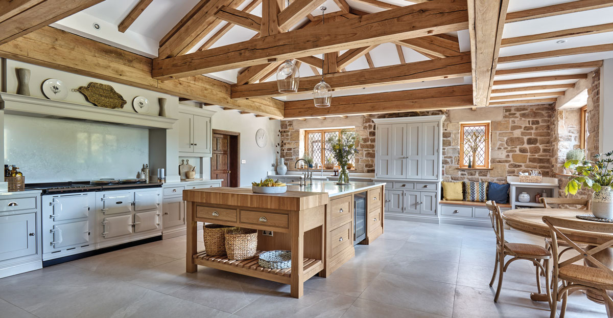 The design team added a vaulted ceiling with beautiful, exposed timber trusses and beams to complement the original stone walls, evoking a sense of history and heritage. Then, the couple carefully selected a warm grey paint colour from Tom Howley’s range, Tansy, for the traditional Hartford shaker cabinetry.