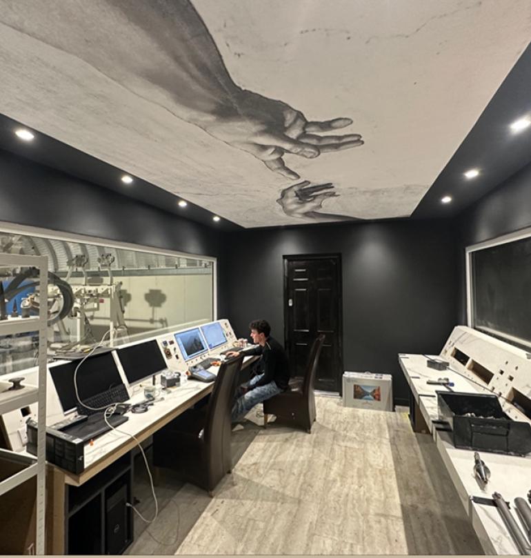 The workshops that house the robots were put up by Steve and Stevie during the Covid restrictions. The control room houses the almost floor-to-ceiling supercomputers that run the robots and isolates the computers and the operators from the work areas.