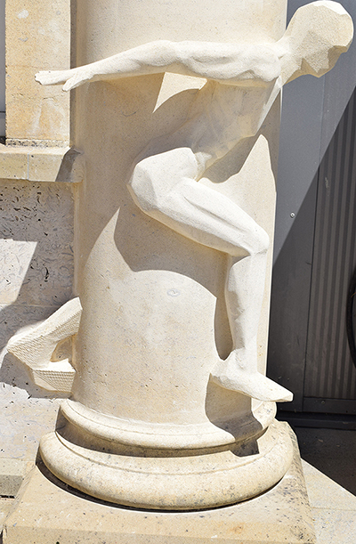 At the front of AF Jones’ workshops and new showroom in Ipsden, Oxfordshire, a carved runner leaves the starting block in the first column of a portico. He runs from column to column, the bold lines and modern idiom of the carving symbolising the innovation and modernisation of the company. On the sixth column, embellished with intricate hand carving, he stretches for the finishing line.