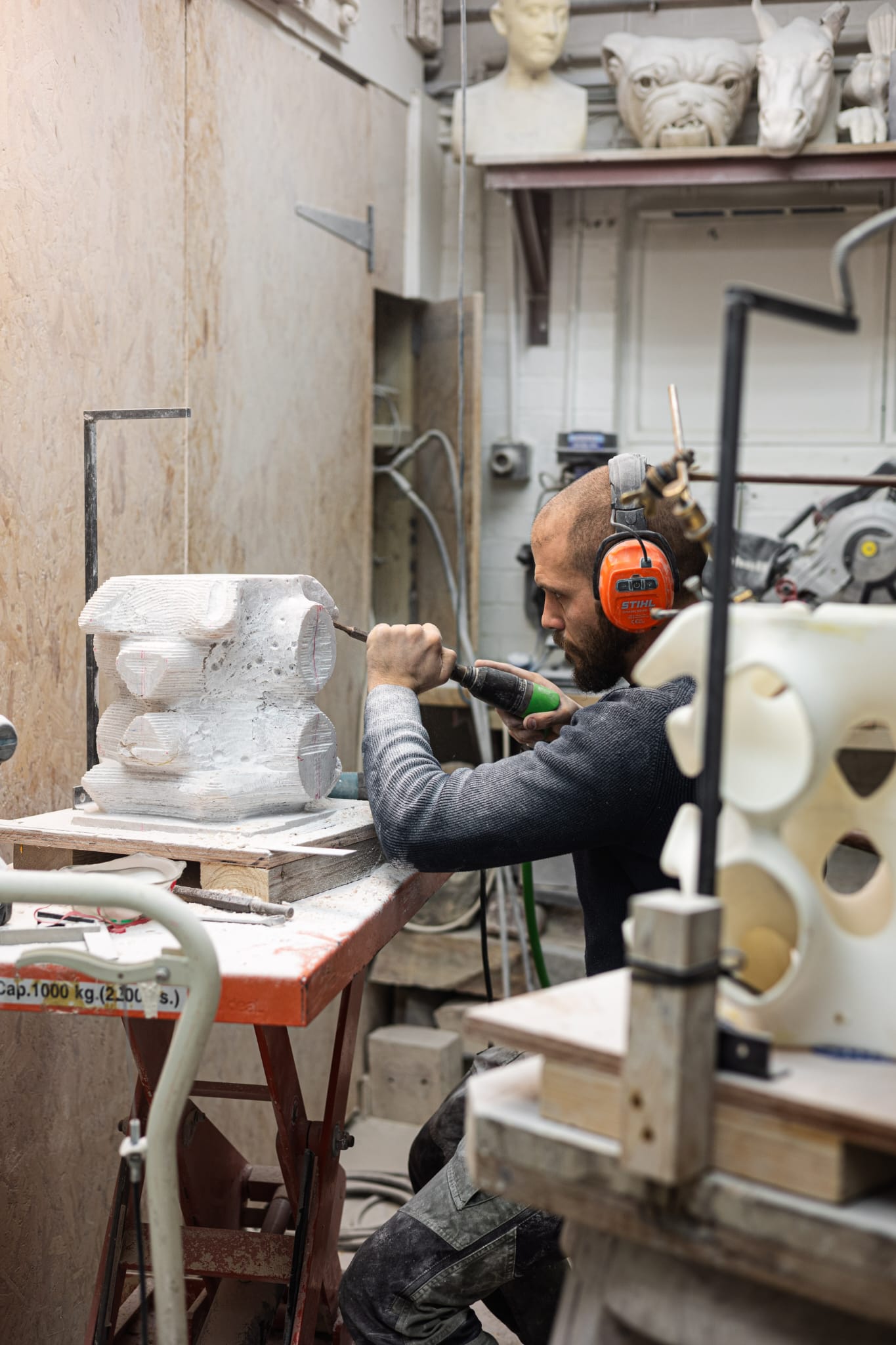 The piece is still in progress, with Mondragon refining its contours through a close, hands-on relationship with the stone at London Stone Carvers. As the form emerges, the surface appears to ripple and pulse, its carved undulations catching and diffusing light. Alabaster is central to that effect: its relative softness allows for finely modulated carving, while its translucency introduces depth and a subtle internal glow.