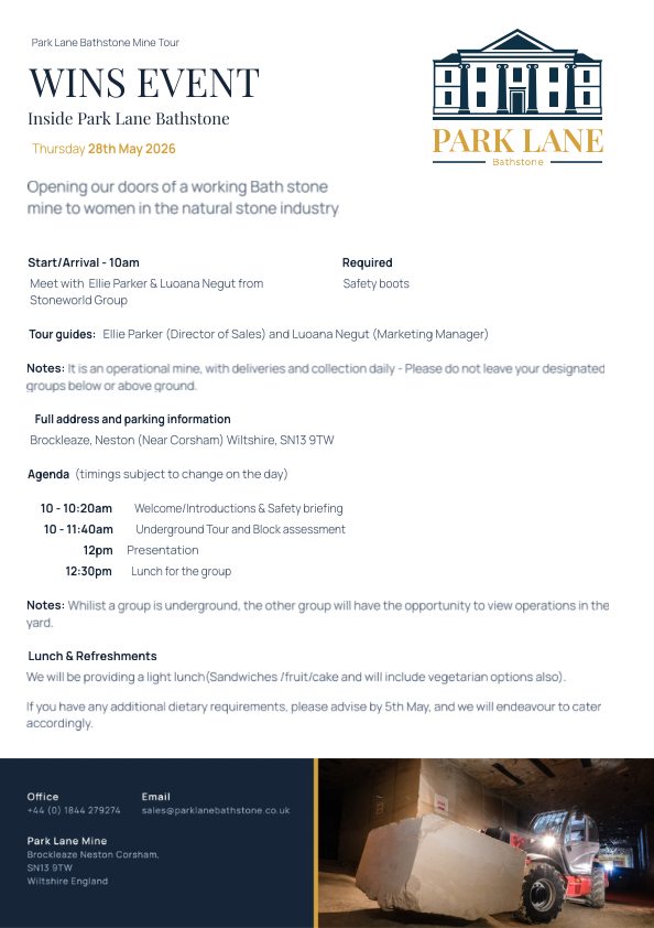 Women in Natural Stone (WINS) will host its next industry event on Thursday, 28th May, offering members and guests a special opportunity to visit a working Bath Stone mine at Park Lane Bathstone in Wiltshire.