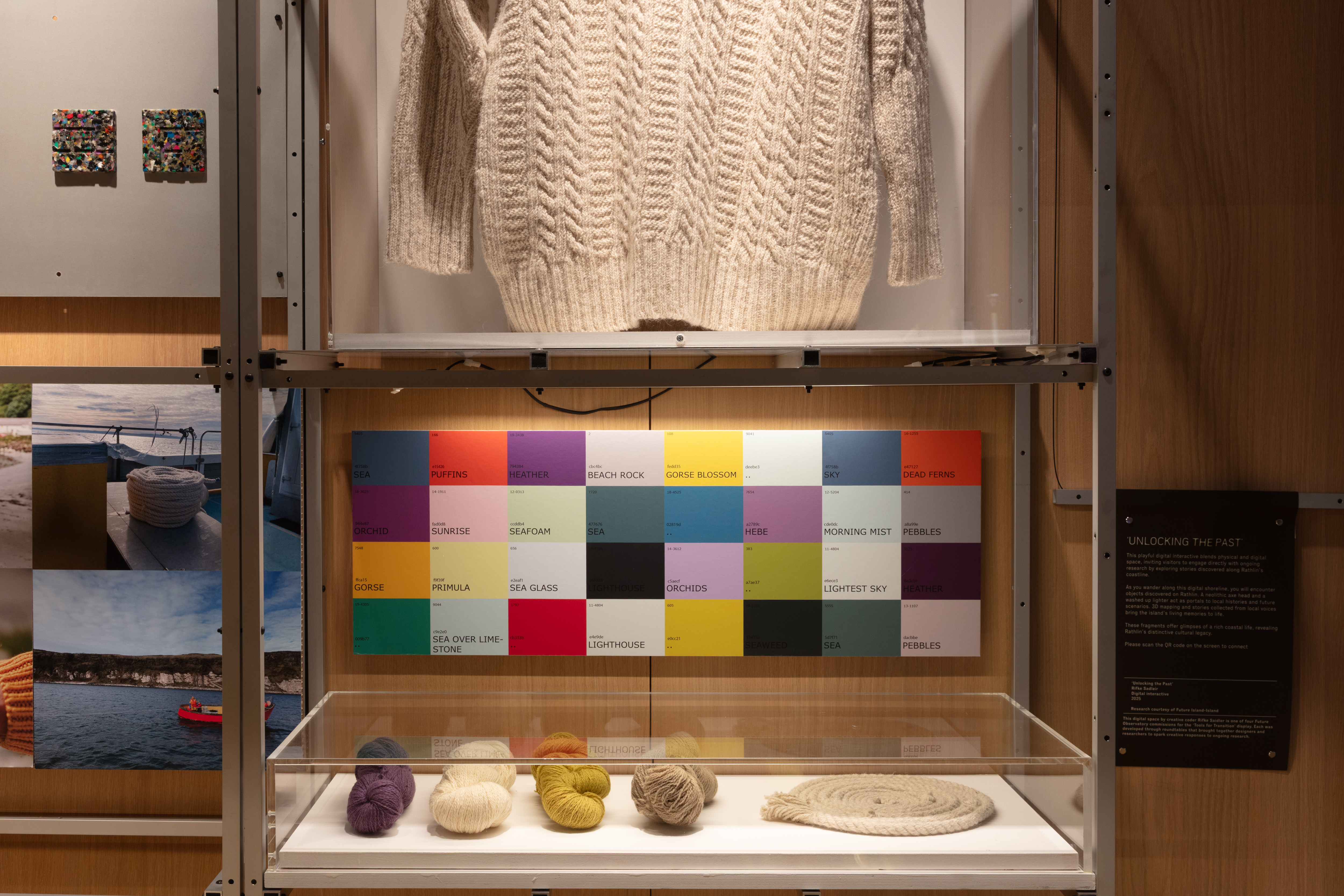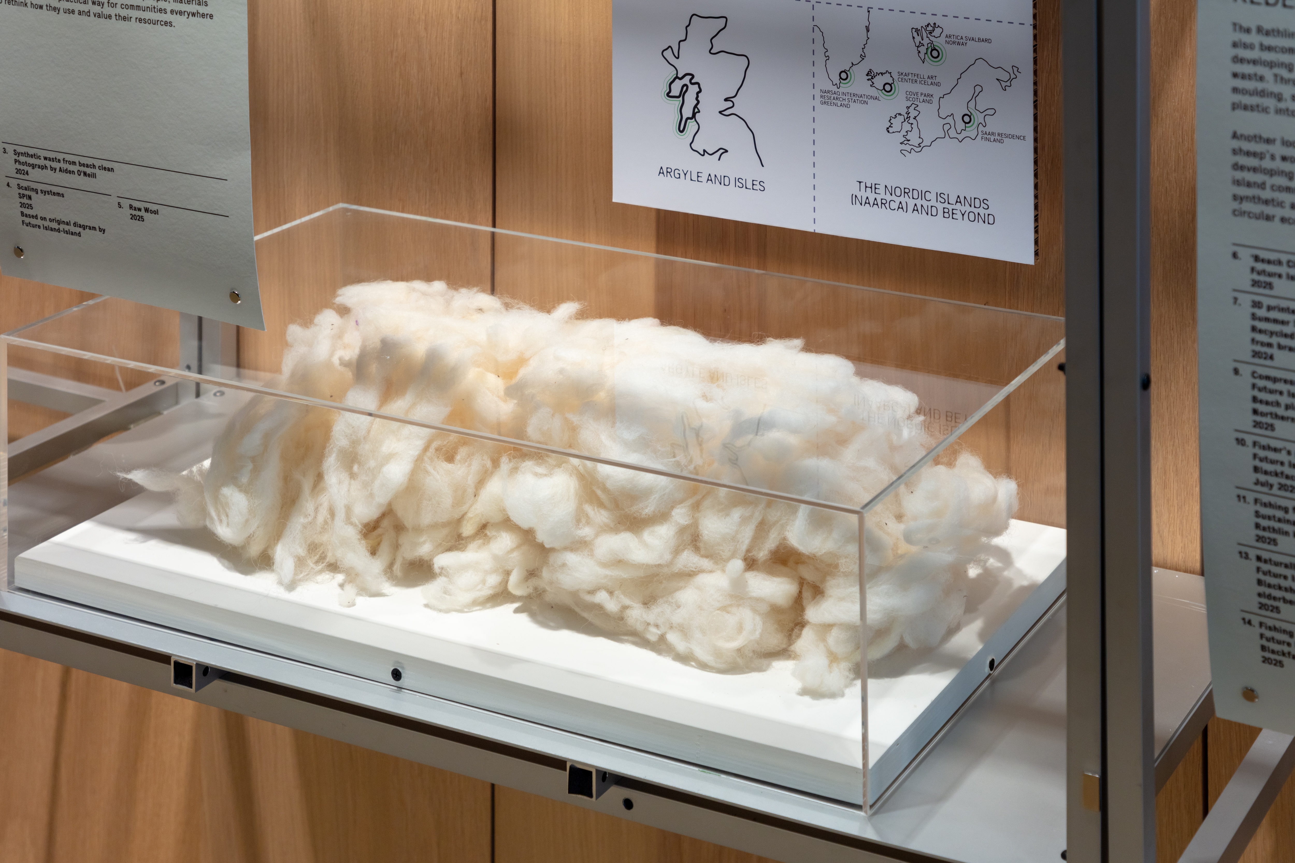 Another strand of the exhibition, Future Island–Island, is rooted in Rathlin Island, Northern Ireland’s only inhabited offshore island. With a small population and a heightened exposure to climate impacts, the island provides a testbed for community-driven resilience. The research supports residents in setting up circular systems to manage waste, resources and local production as part of Rathlin’s goal to achieve carbon neutrality by 2030. Repair cafés, shared waste initiatives and design-led approaches to local materials all play a part in building self-sufficiency. Material innovation is prominent: Rathlin’s sheep’s wool, previously undervalued, is being channelled into the Rathlin Wool Hub, where it becomes a useful raw material for craft and product design. Meanwhile, the Beach Clean 2.0 initiative is transforming marine plastic washed ashore into functional items for the community. In the exhibition, naturally dyed wool sits alongside categorised marine plastic samples, and an interactive installation by Rifke Saidler introduces visitors to Rathlin’s coastline and stories. While highly localised, the work highlights principles of resource circularity, decentralised production and community ownership that could be adopted in other rural or coastal regions.