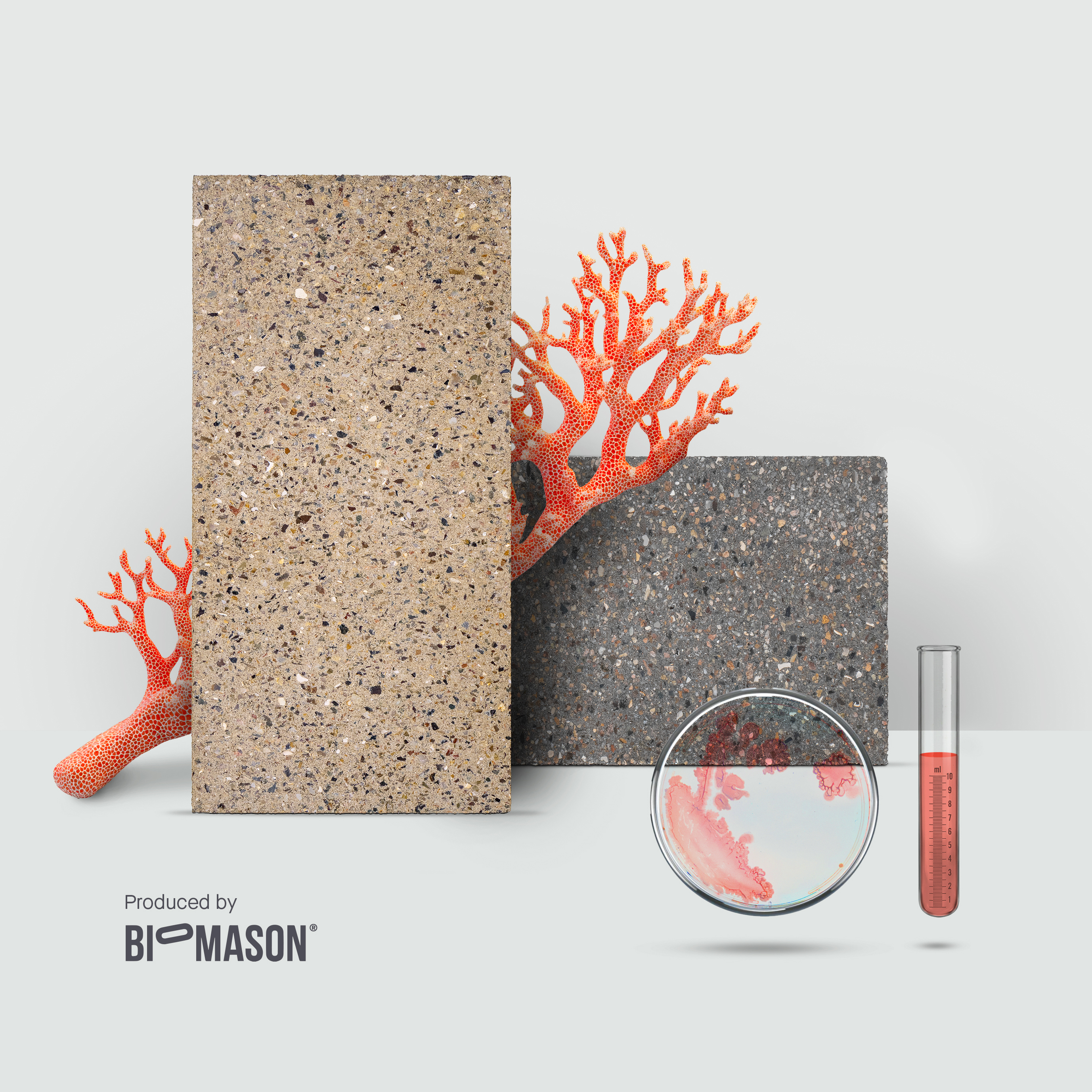 Inspired by coral formation, Mimmik tiles are produced using microbial mineralisation rather than kiln-fired cement production. The science behind the range almost sounds like a passage from Sci-fi fiction, with bacteria binding aggregates together through Biomason’s Zymecrete™ process, which forms calcium carbonate without the extreme temperatures associated with conventional cement manufacture.