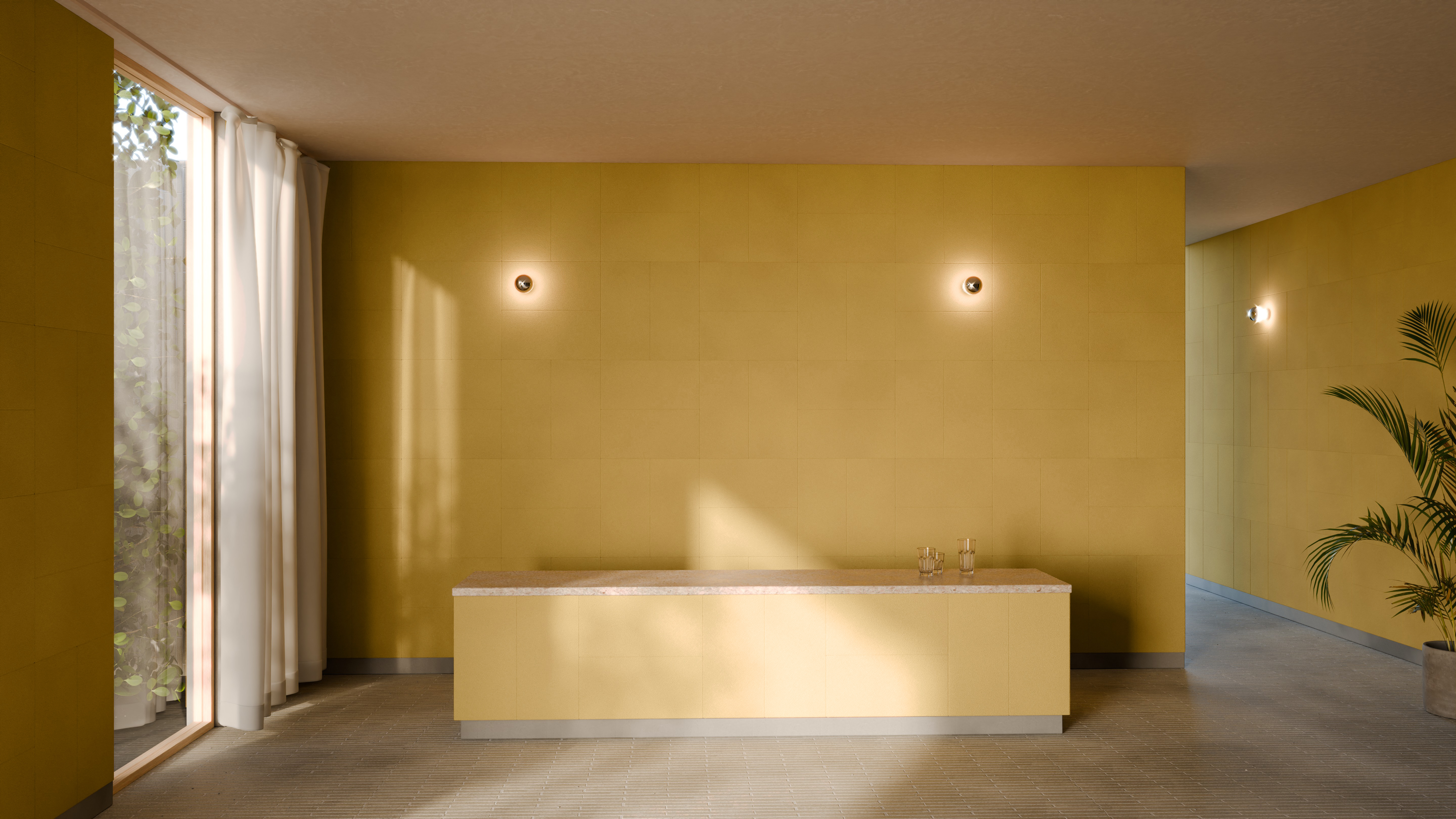 Meanwhile, CornWall acoustic panels utilise agricultural waste derived from corn production. The interior wall finish is made using the cores of regionally sourced corn cobs that would otherwise be burned, fermented or left as agricultural waste. The resulting plant-based biomass locks in carbon absorbed during crop growth, resulting in a climate-positive profile in which more CO₂ is stored than emitted during manufacture. Supplied as precision-made panels with a demountable anchoring system rather than adhesive fixing, it is conceived for circular use. Bio-coated for moisture resistance and available in pigmented colourways, CornWall offers a firm, durable surface comparable in performance to HPL or hardwood while remaining thinner and suitable for CNC milling.