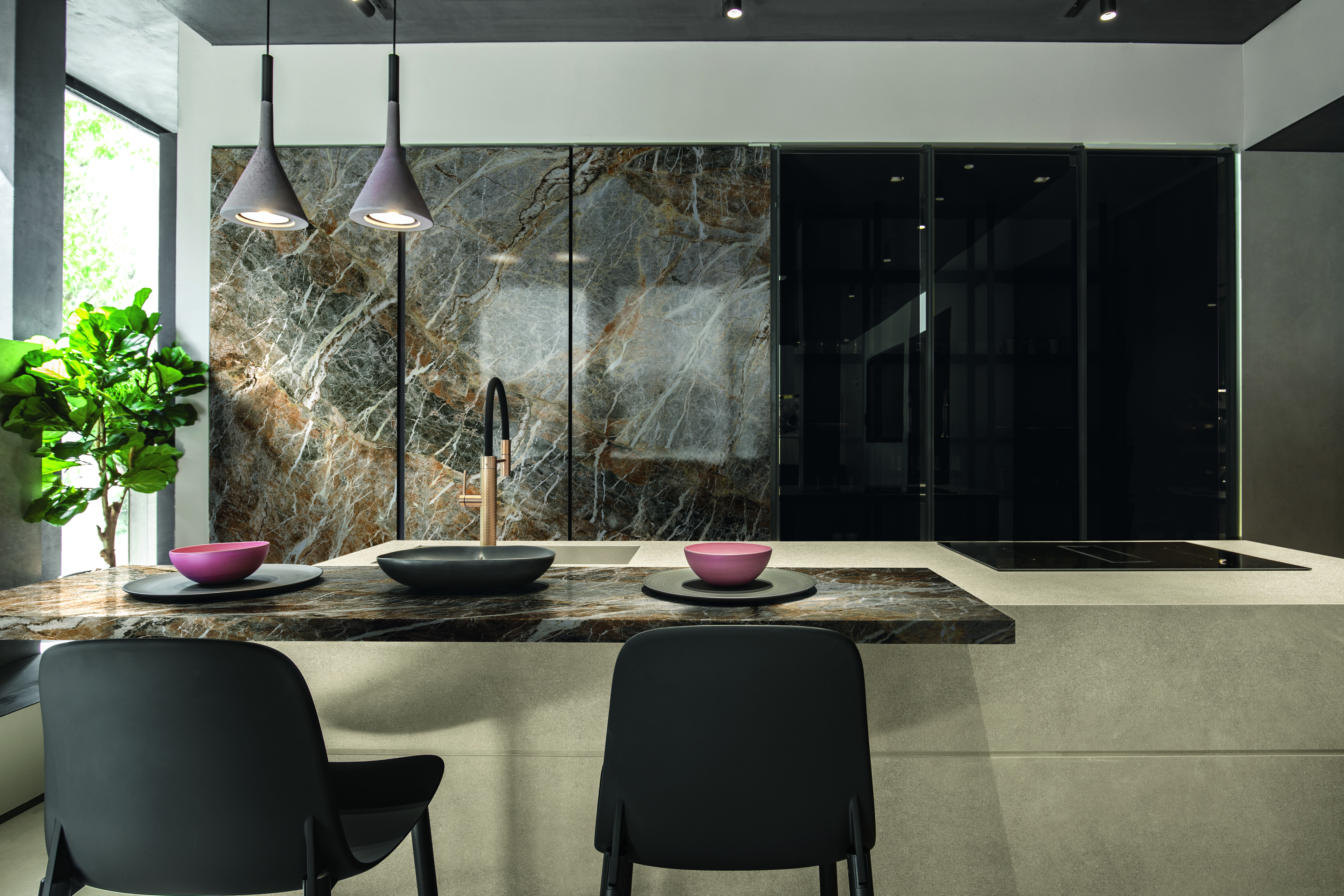 Recent introductions illustrate the breadth of the palette. Designs inspired by quartz and marble explore warm browns, copper-toned veining and soft green hues, while stone-based surfaces reference volcanic lava, limestone and tuff. These interpretations draw on a range of geological precedents, translating their textures and colour variations into porcelain slabs capable of being fabricated into a variety of interior elements.