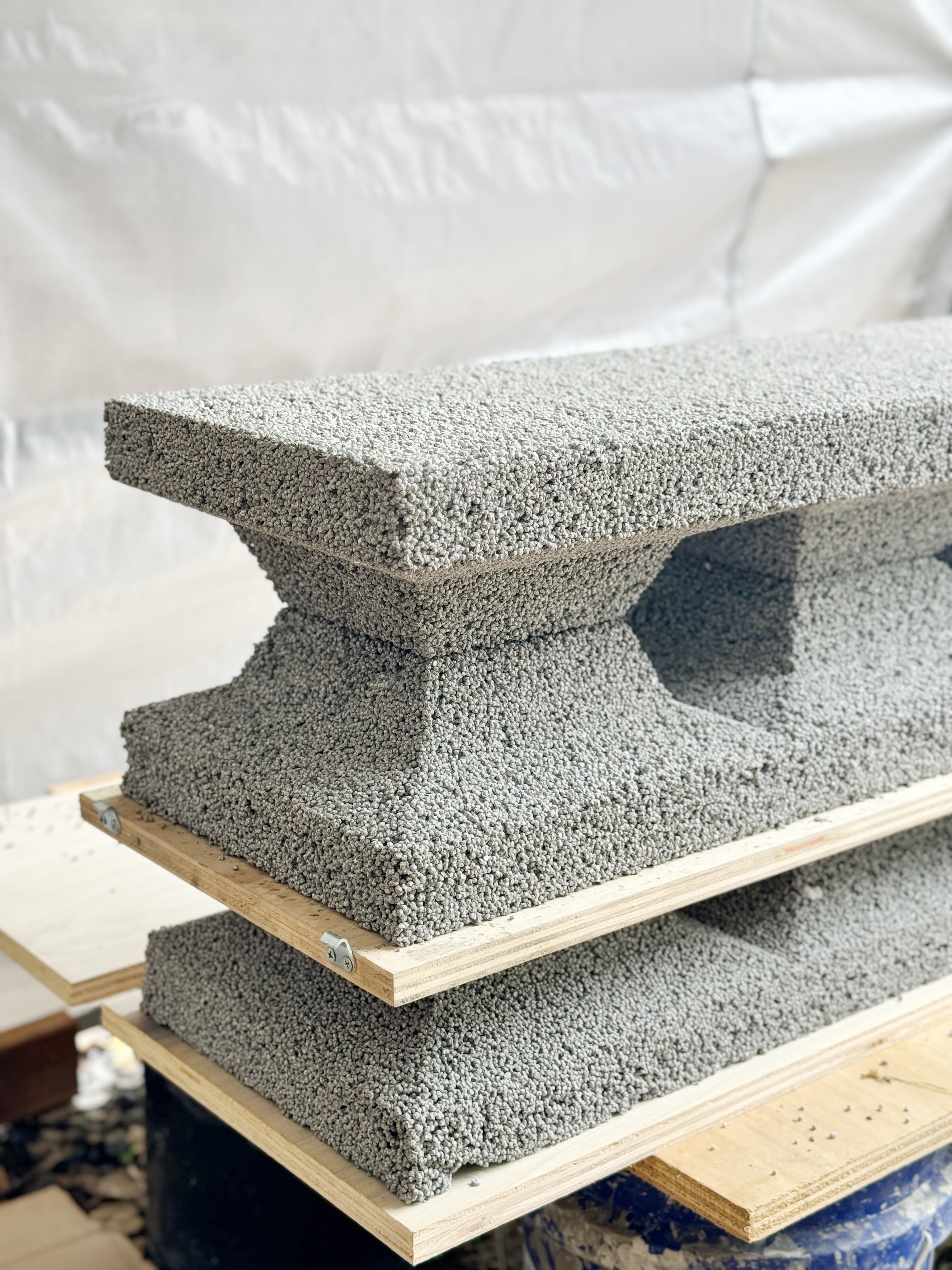 From a surface perspective, the material retains a visible connection to its origins. Unlike conventional concrete block, which tends towards uniformity, Surf Block carries a more heterogeneous character. Fragments of recycled foam are embedded within the matrix, creating a lightly textured, particulate surface that reflects the composite nature of the material. It is not a surface designed for refinement, but one that expresses process, where the narrative of reuse remains legible.