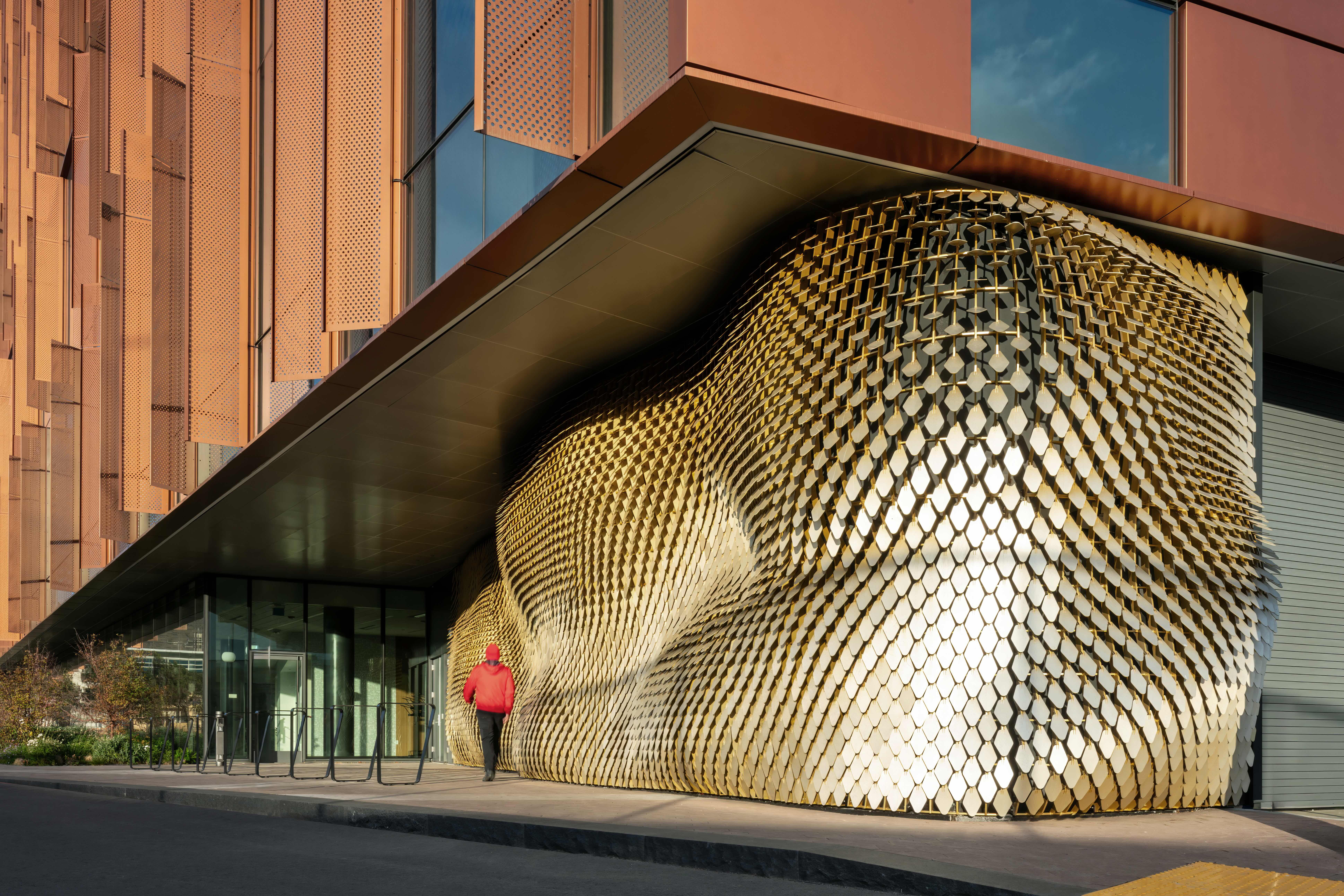 Stretching 17m long and rising 4.2m high, the work is composed of 4,634 individually formed aluminium “petals” mounted on a precisely engineered frame. Set against the clean, planar architecture of the 30,000m² life sciences building, the piece introduces a softer, more tactile counterpoint at street level.